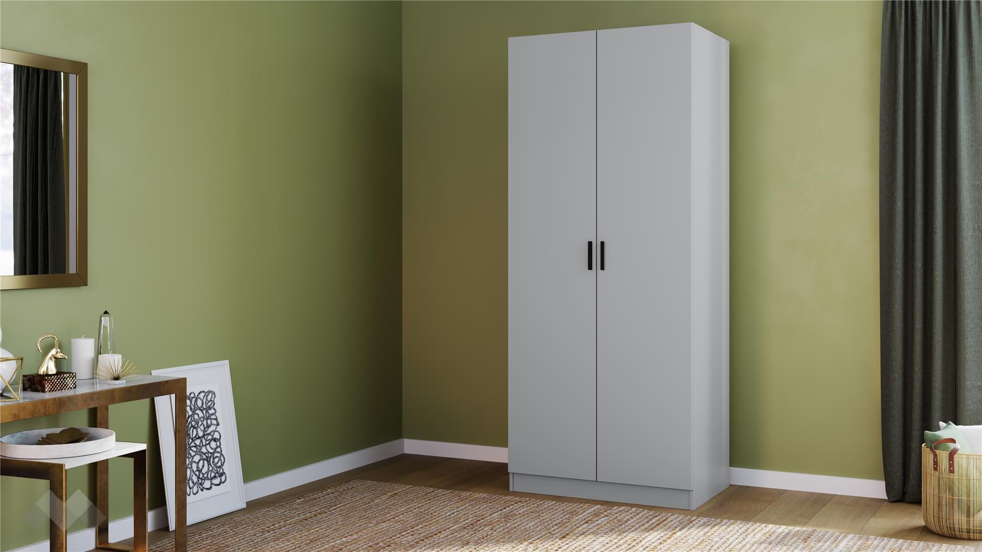 Двукрилният гардероб разполага с четири рафта и лост за закачалки, което ти позволява да организираш дрехите си по най-удобния за теб начин. Практичното вътрешно разпределение осигурява лесен достъп до всеки тоалет и оптимално използване на пространството.