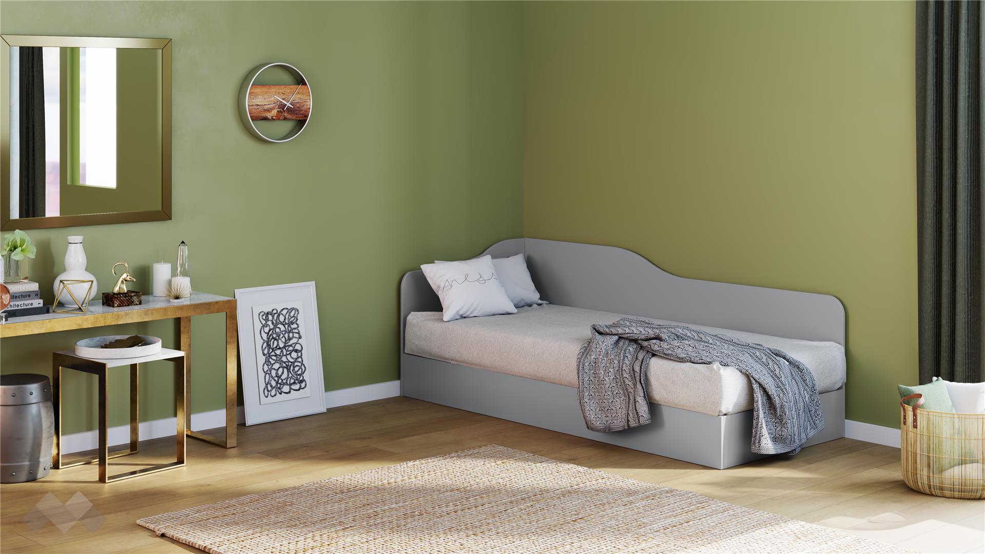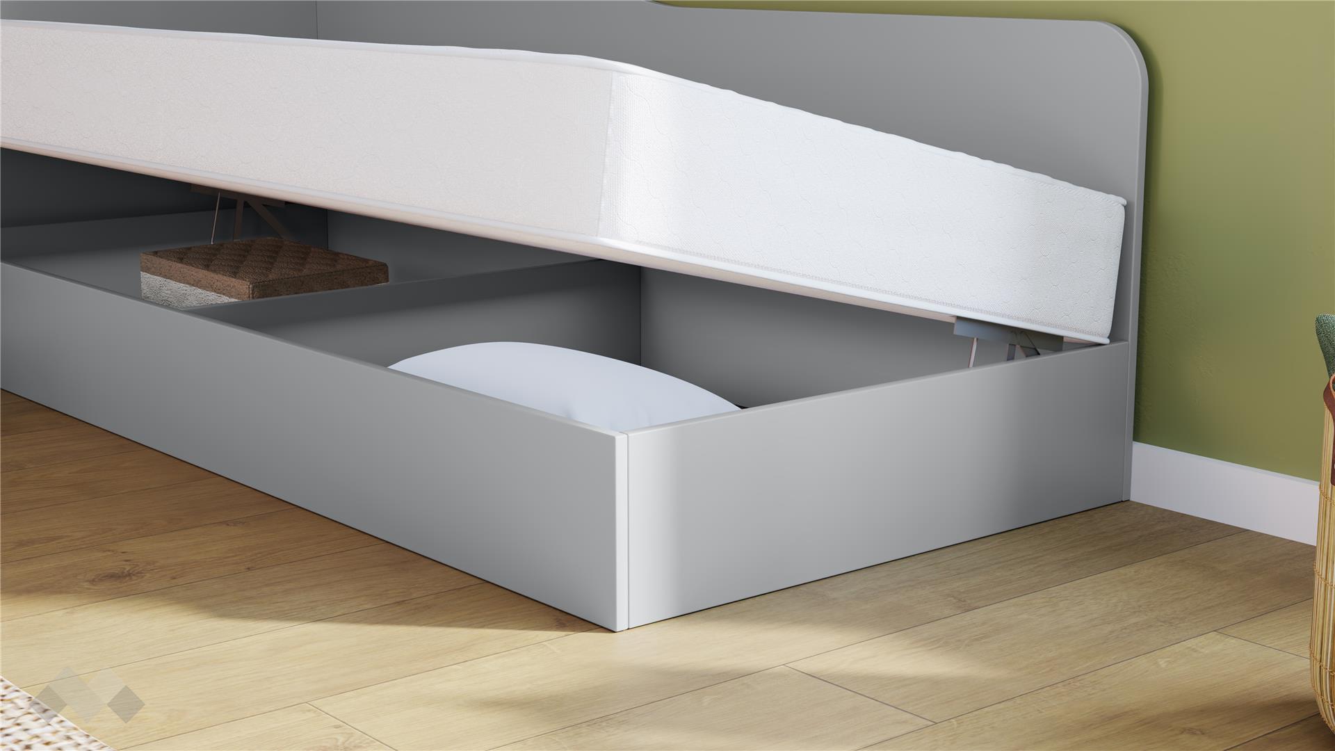 Ъгловото легло е подходящо за матрак с размери 82/190 см. Леглото е с универсално разположение – по време на монтажа, изолиращата табла и механизма могат да се монтират отляво или от дясно, така че да пасне идеално на стаята. Включеният повдигащ пружинен механизъм осигурява лесен и бърз достъп до подматрачното пространство, което е перфектно за съхранение на спално бельо, играчки, сезонни дрехи и други вещи.