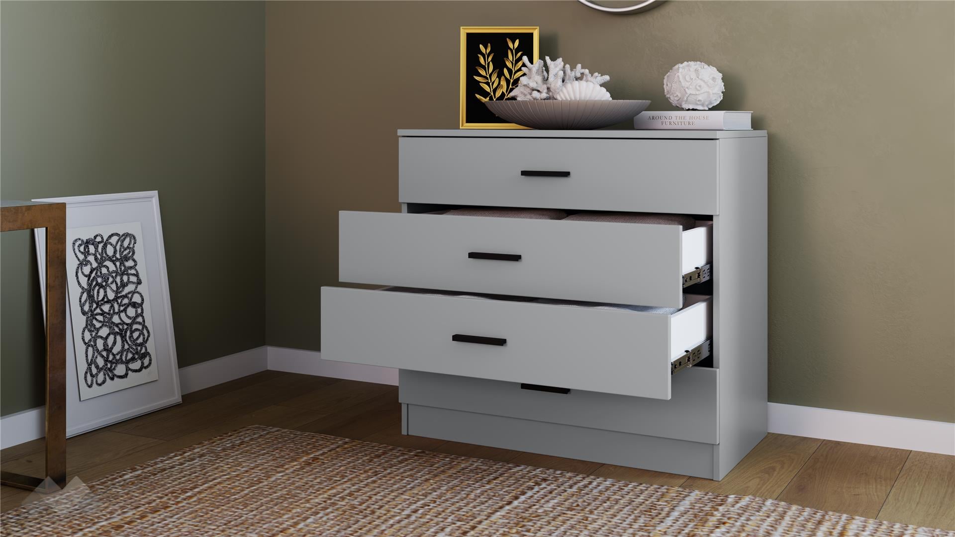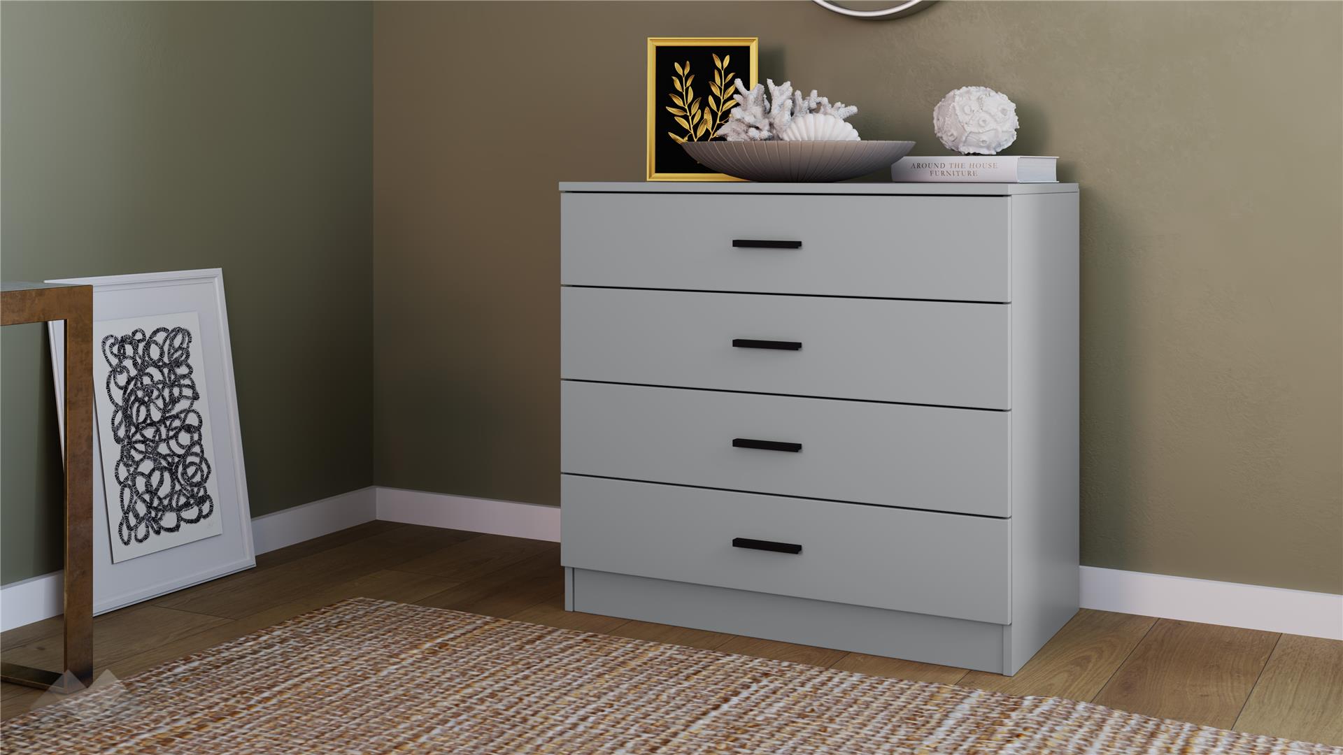 Скринът предлага четири просторни чекмеджета, подходящи за организиране на бельо, аксесоари и други вещи. Горният плот е идеален за подреждане на любими снимки, книги или други вещи, които да са ти винаги под ръка или да придадат допълнителен акцент на интериора.