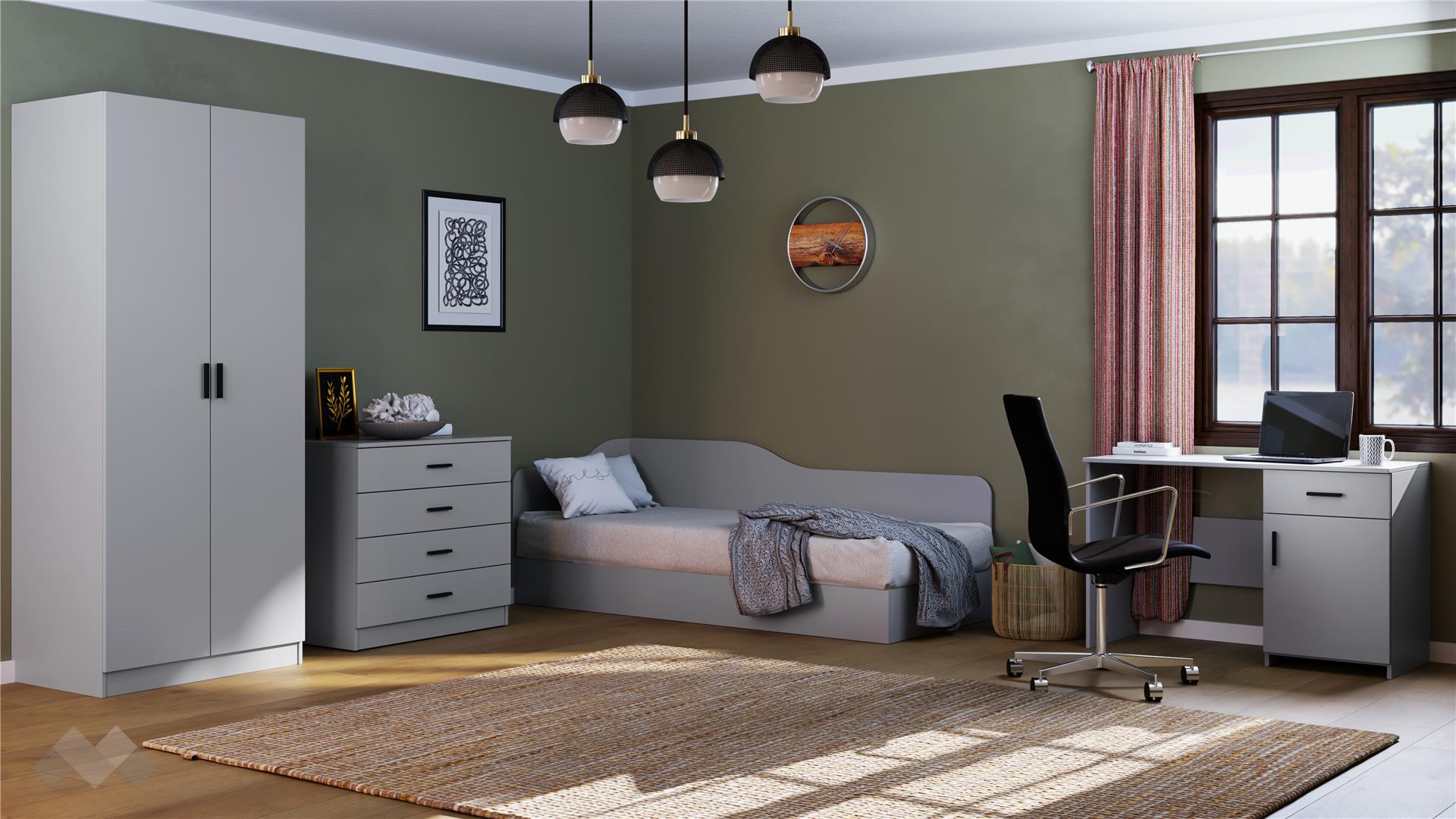 ⭐ Предимства: ✓ легло с меки линии ✓ за матрак 82/190 ✓ двукрилен гардероб с 4 рафта и лост за закачалки ✓ скрин с 4 чекмеджета ✓ бюро с шкаф и чекмедже ✓ семпъл дизайн ✓ повдигащ механизъм ✓ делител на подматрачното пространство ✓ механизъм за плавно затваряне ✓ качествена изработка ✓ 16 мм ПДЧ