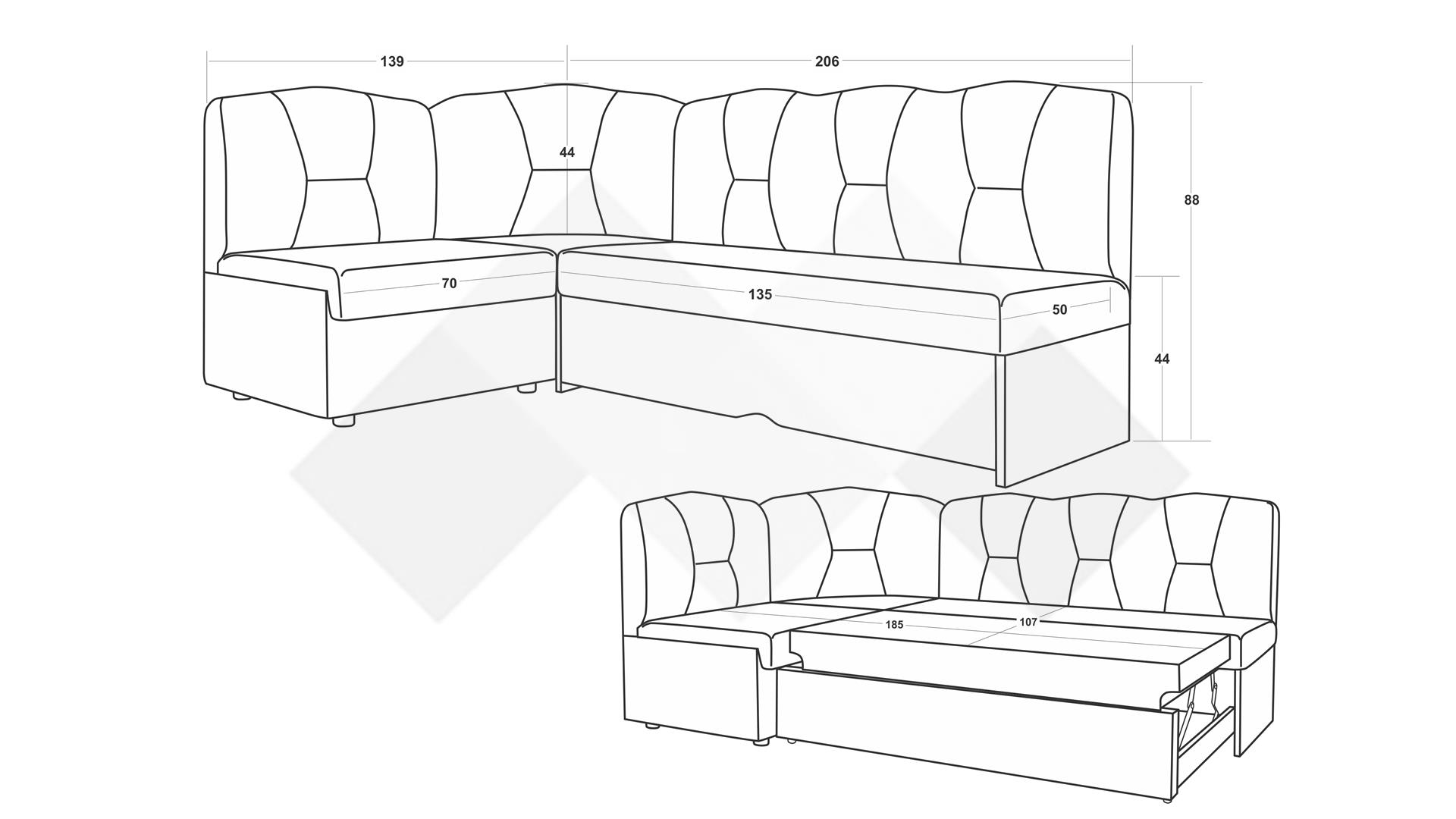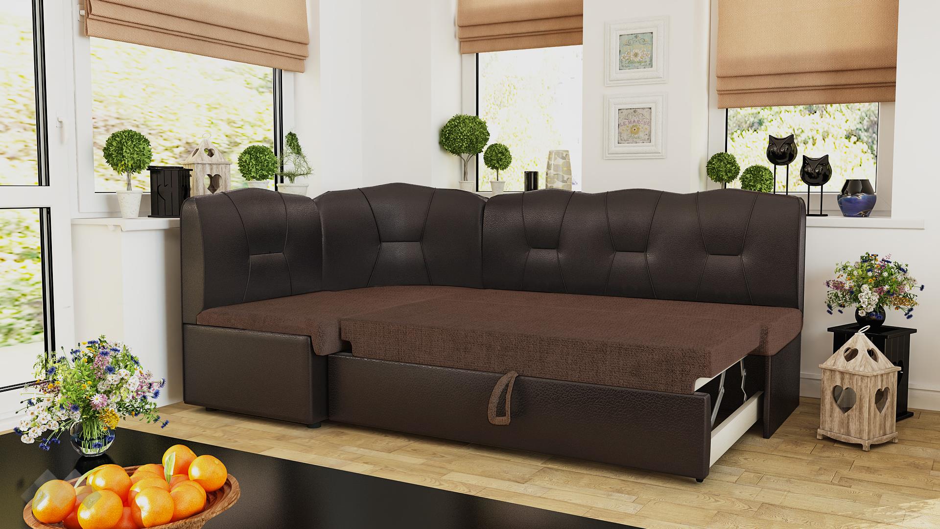 Кухненски ъгъл Смайл е подходящ за спане. Дамаската на изтеглящия се подматрак е същата като на седалната част. Комфортът на двете части е еднакъв, или цялата площ за спане е с еднаква мекота. Допълнително място за съхранение осигурява раклата под късата част.