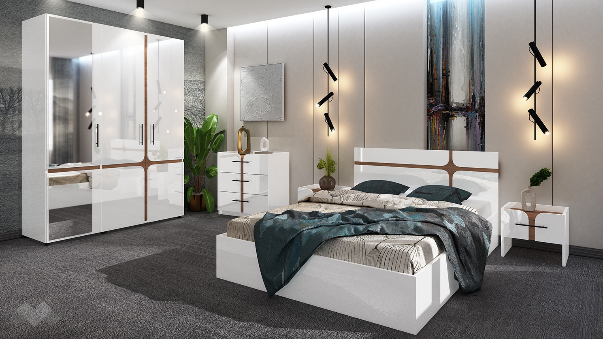 Този изискан спален комплект съчетава модерен стил, функционалност и усещане за простор. Изработен в елегантен бял гланц, с декоративни акценти в топлия и естествен нюанс дъб денвър, той придава свежест и светлина на интериора, като същевременно осигурява необходимия комфорт и ред във всекидневието.