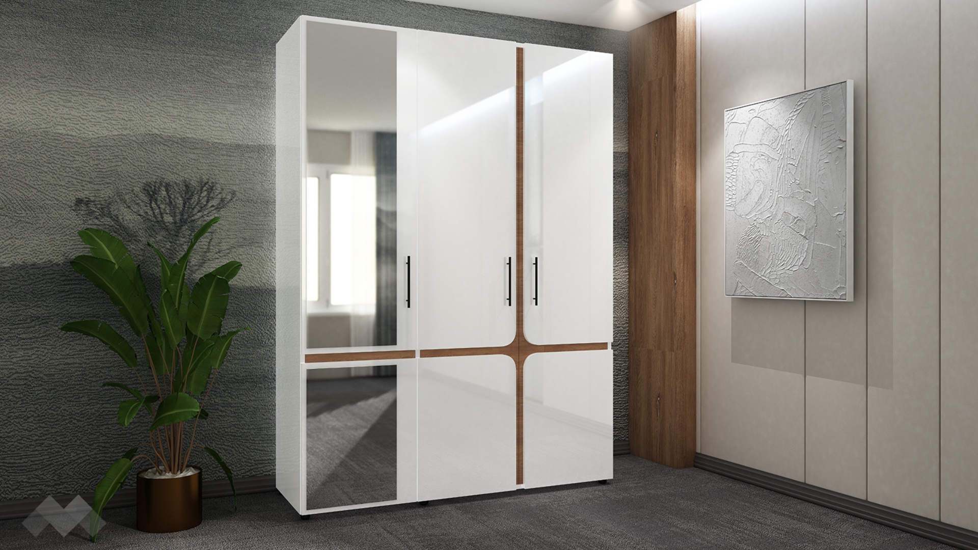 Трикрилният гардероб впечатлява със своята вместимост и голямо огледало на една от вратите. Съчетава рафтове и лост за закачалки, осигурявайки отлично организирано пространство за дрехи и аксесоари. Гланцовите фронтове визуално разширяват помещението, а дървесният акцент внася топлина и характер.