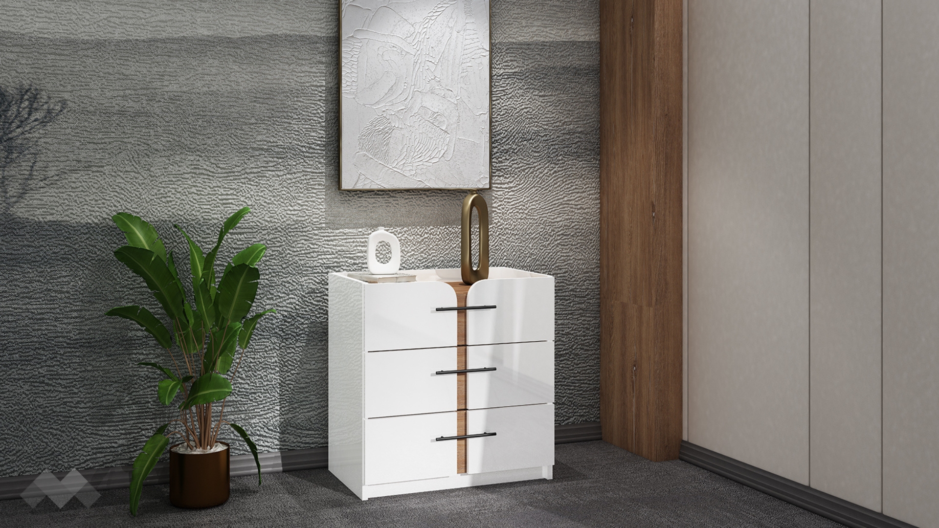 Комплектът се допълва от компактен скрин с три чекмеджета, който е идеален за подредба на бельо, козметика или други вещи. Плотът му предлага допълнителна повърхност за декоративни елементи като лампа, ароматна свещ или рамка със снимка.