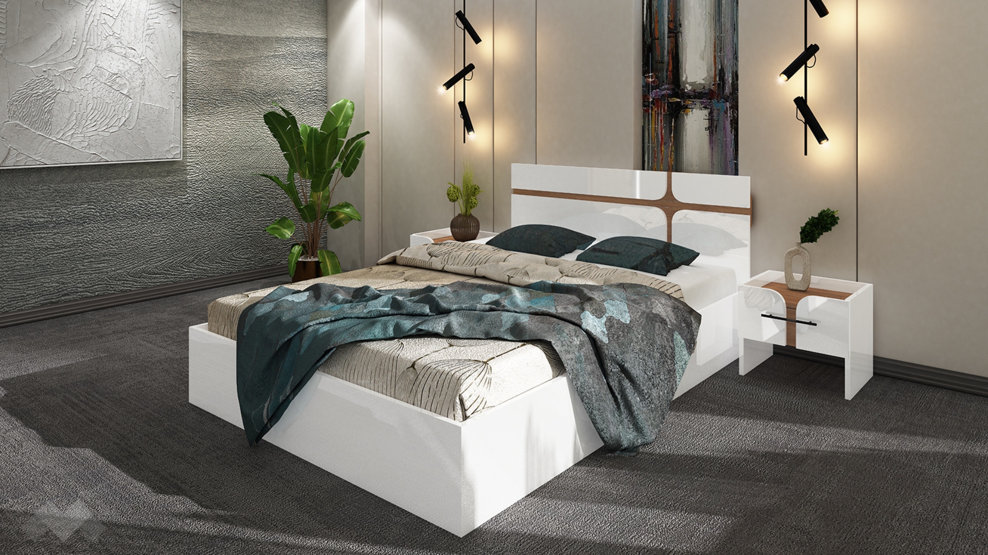 Централният елемент на комплекта е просторната спалня подходяща за матрак 160/200, придружено от две нощни шкафчета с изчистен дизайн – идеални за съхранение на книги, зарядни устройства и лични вещи. Шкафчетата са с удобна височина, което допринася за удобството. Акцентът от дъб върху таблата на спалнята и плота на нощните шкафчета подчертават естествения характер на дизайна и създават приятен визуален контраст.