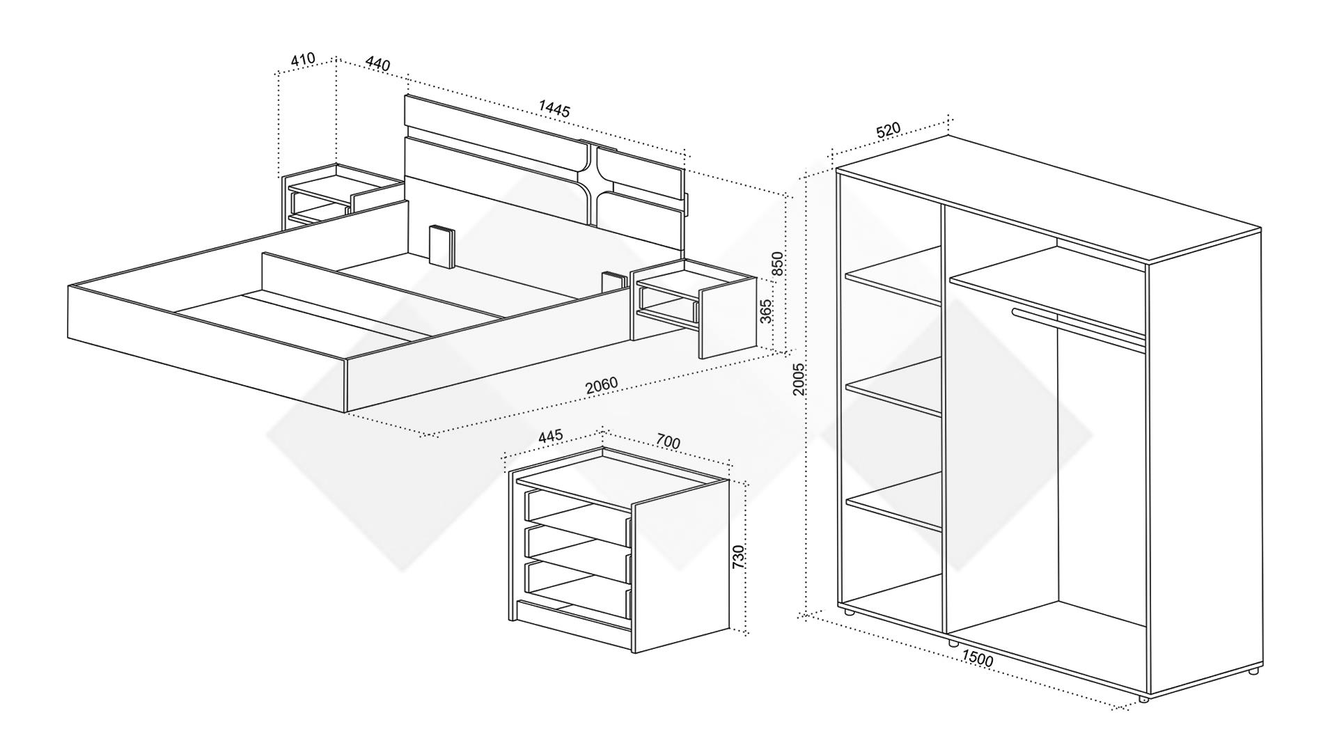 Спалня: Д: 206 см Ш: 144,5 см В: 85 см