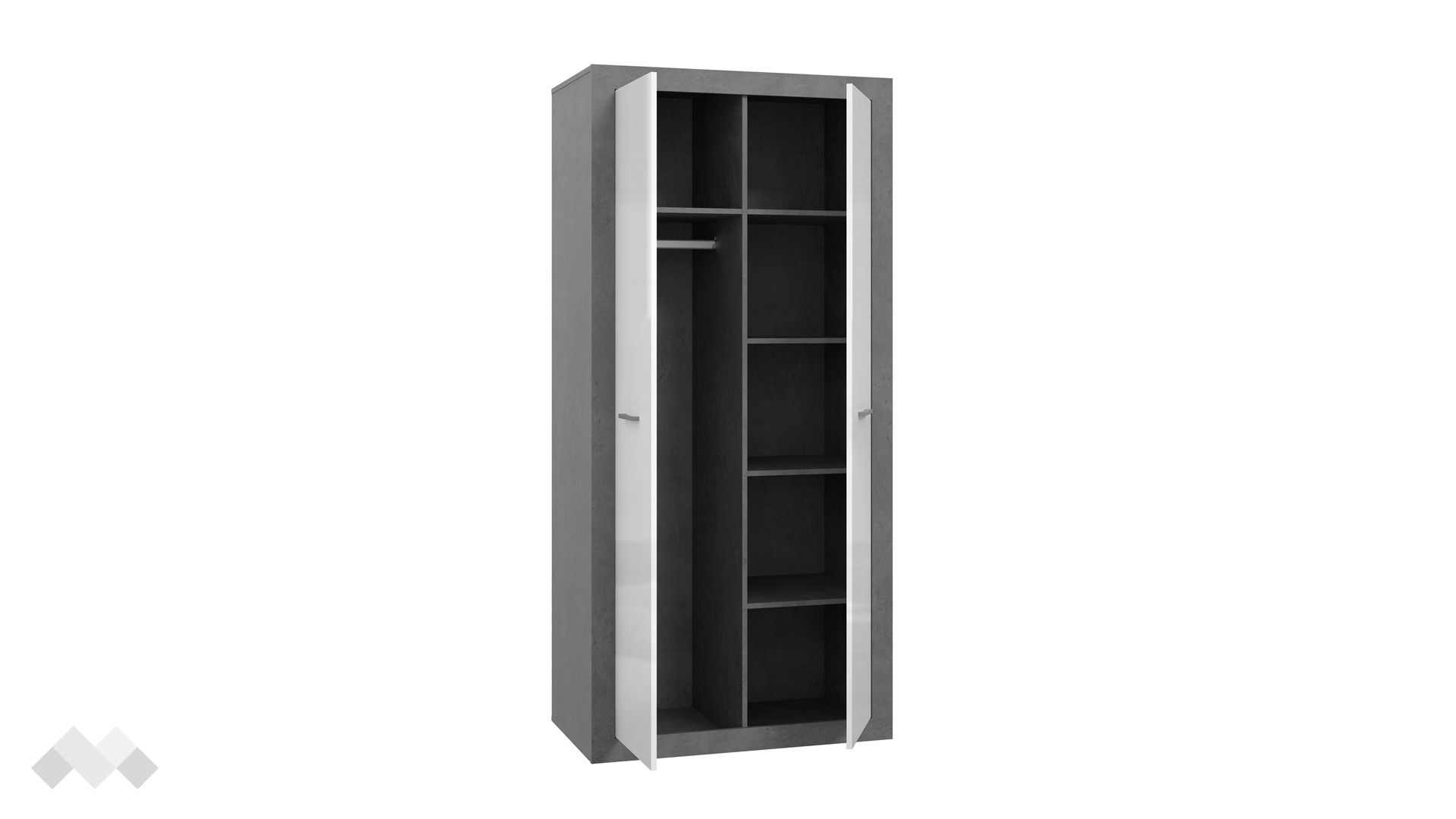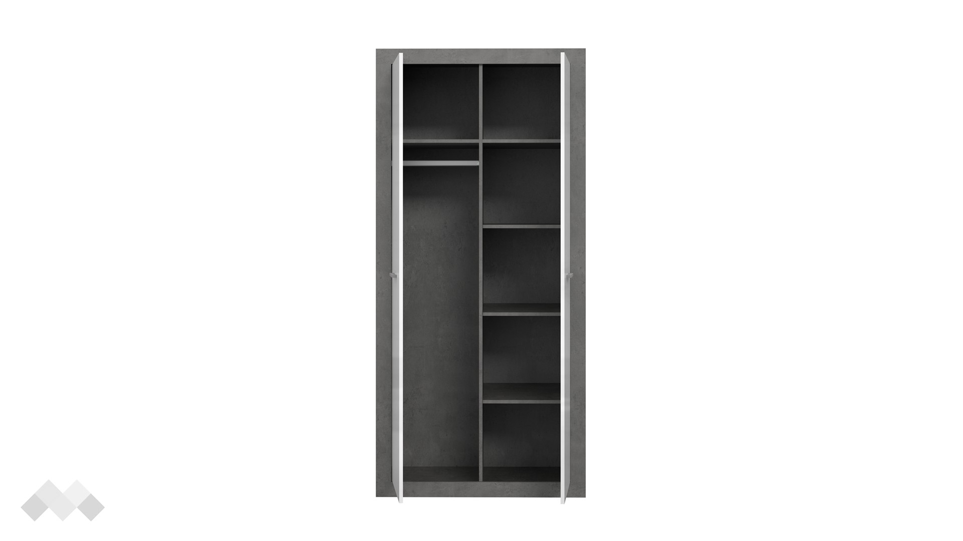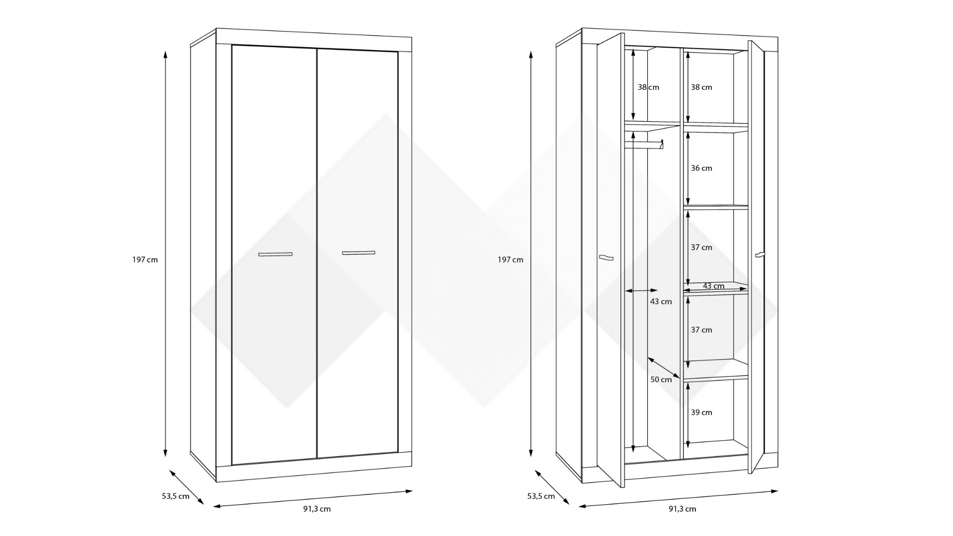 Гардероб Требия ще ви впечатли с неутралния си декор, съчетаващ се добре както с цветове в сивата, така и с цветове в бялата гама. Има практично разпределение, което ти позволява да подредиш добре всички дрехи и аксесоари. Той е двукрилен, с 5 обемни рафта и лост за закачалки. Можеш да използваш рафтовете за съхранение на сгънати дрехи, по-обемни пуловери, завивки или други вещи, а на лоста да закачите всичко, което искате да бъде готово за обличане.