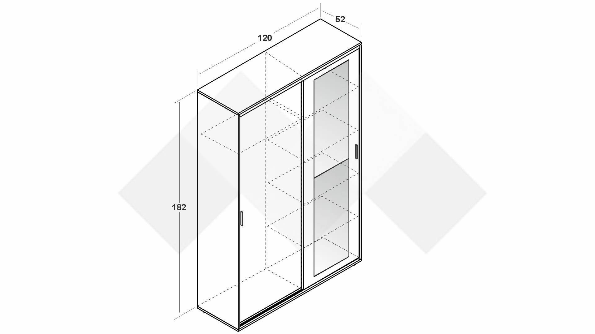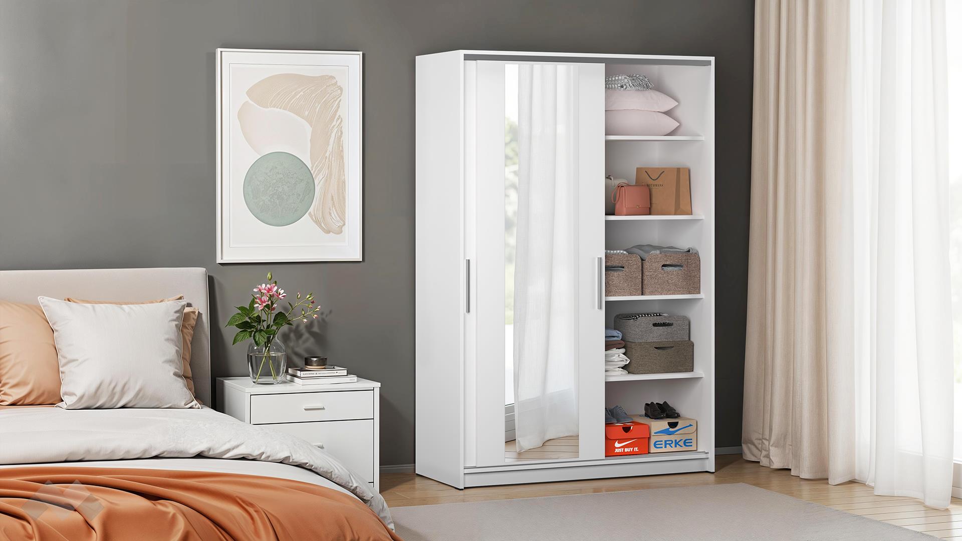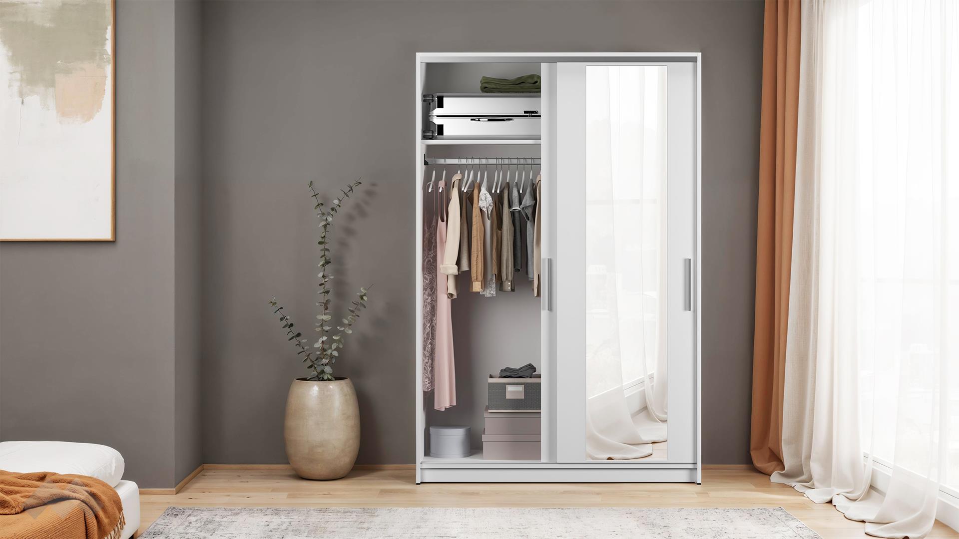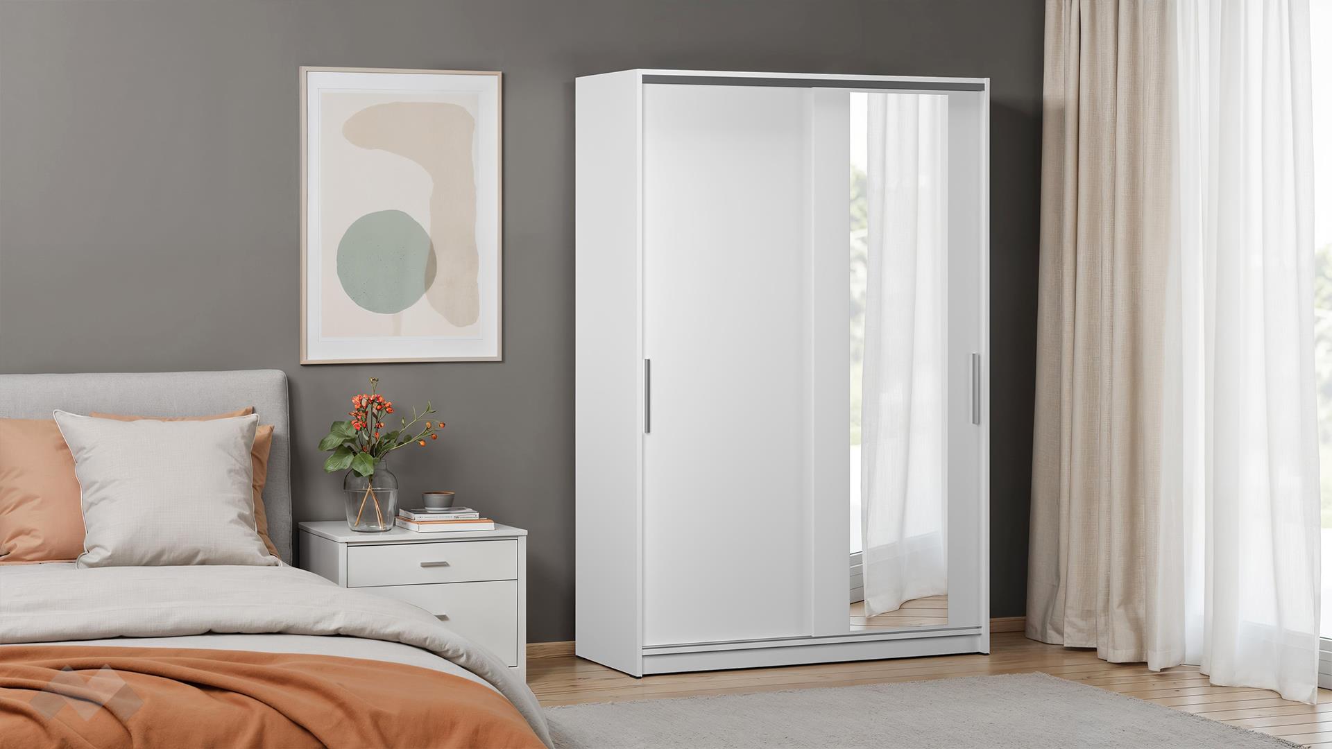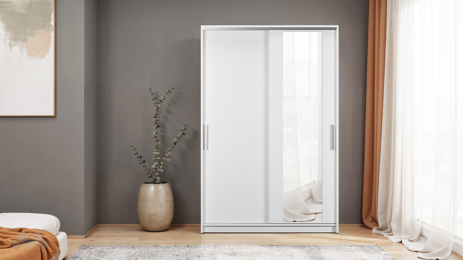Гардероб с плъзгащи врати Трендлайн 120 см. разполага с две плъзгащи врати, което го прави изключително практичен избор за по-малки пространства, тъй като не изисква допълнително място за отваряне. Едната врата е изцяло огледална – функционално решение, което визуално разширява стаята и осигурява удобство при обличане. Другата врата е в изчистен бял панел, допълващ елегантната визия.