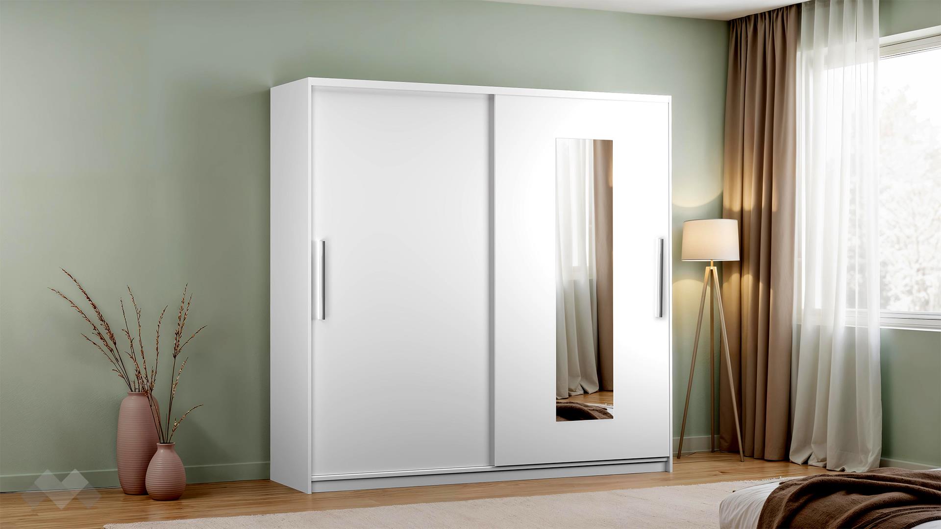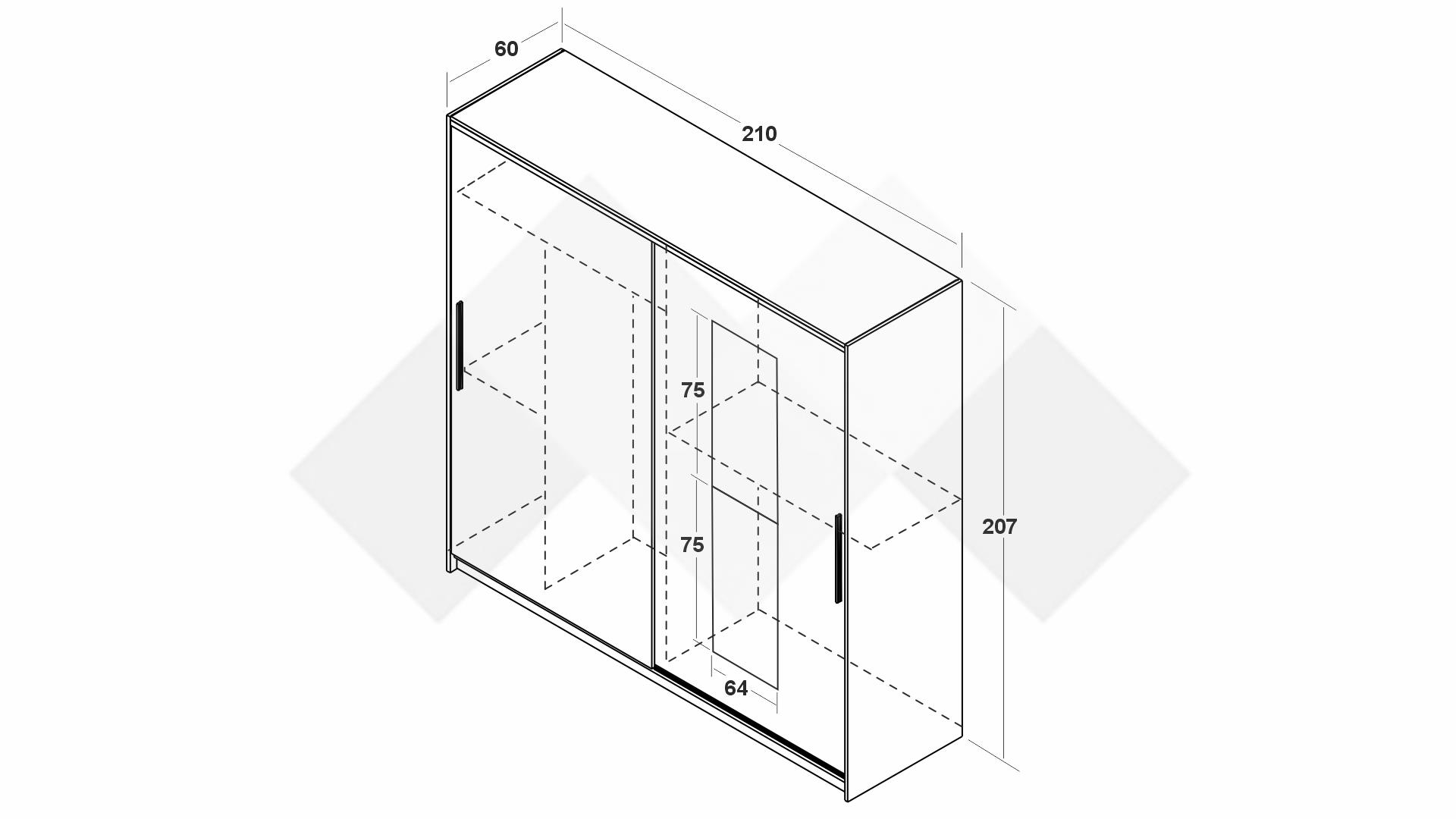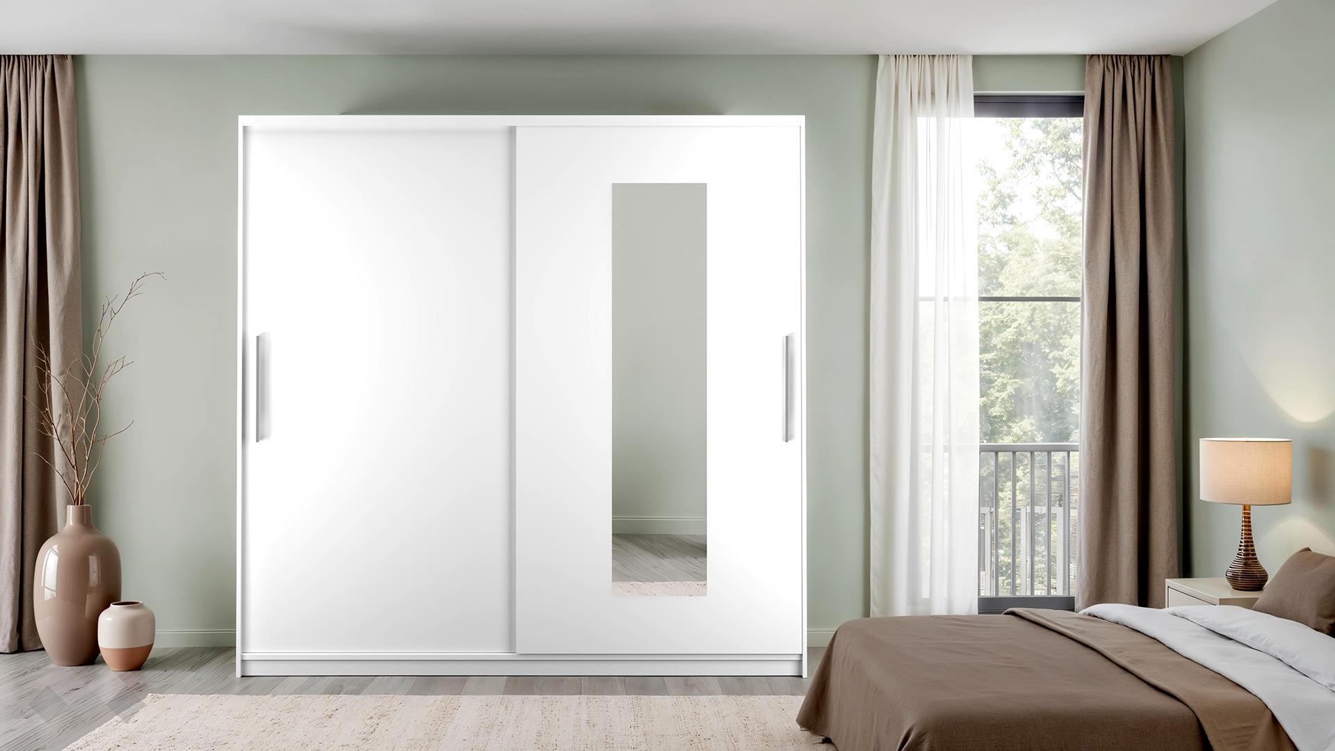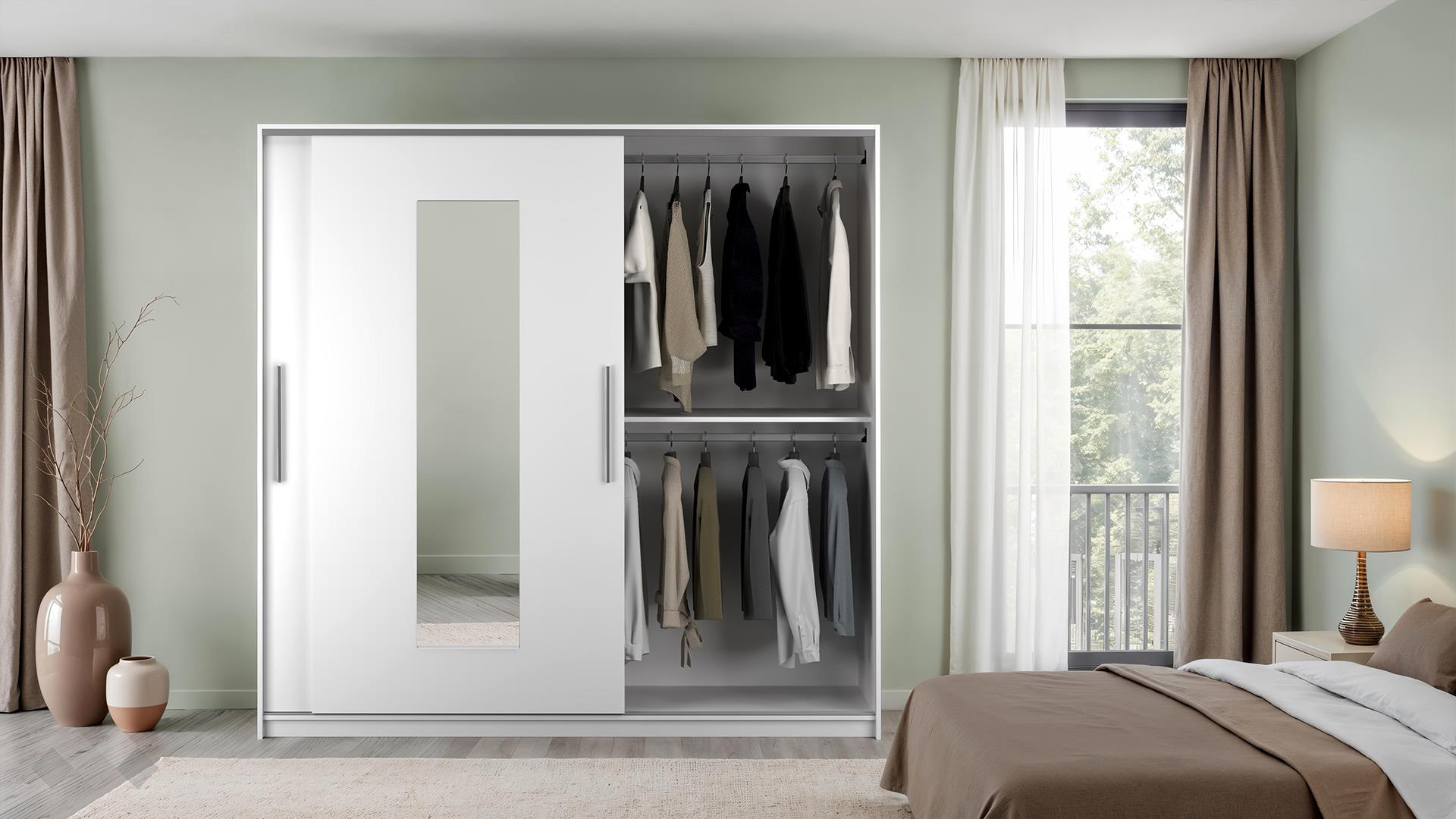 Гардероб с плъзгащи врати Трендлайн 210 см. разполага с две плъзгащи врати, което го прави изключително практичен избор за по-малки пространства, тъй като не изисква допълнително място за отваряне. Едната врата е с огледало – функционално решение, което визуално разширява стаята и осигурява удобство при обличане. Другата врата е в изчистен бял панел, допълващ елегантната визия.