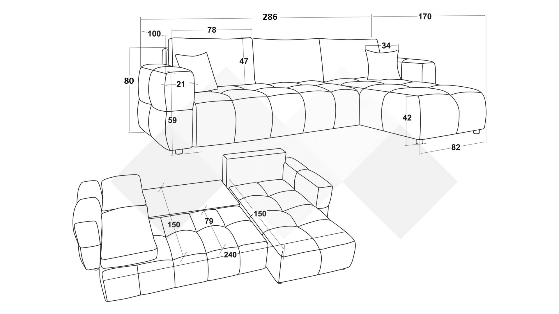 Функцията сън се активира чрез падащ гръб, с което диванът се трансформира в голяма и комфортна спалня с площ 240/150 см – идеална както за ежедневна употреба, така и за настаняване на гости.