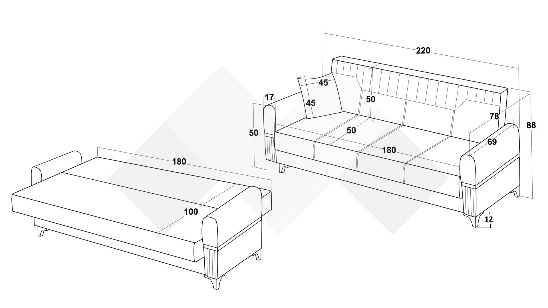 Освен елеганстен, диван Верино е и функционален – с минимално усилие се превръща в комфортно и просторно легло с размери 100/180 см, благодарение на клик-клак механизъм. А отдолу се крие просторна ракла, в която може да съхраниш завивки, още възглавници или вещи, които да са на една ръка разстояние.