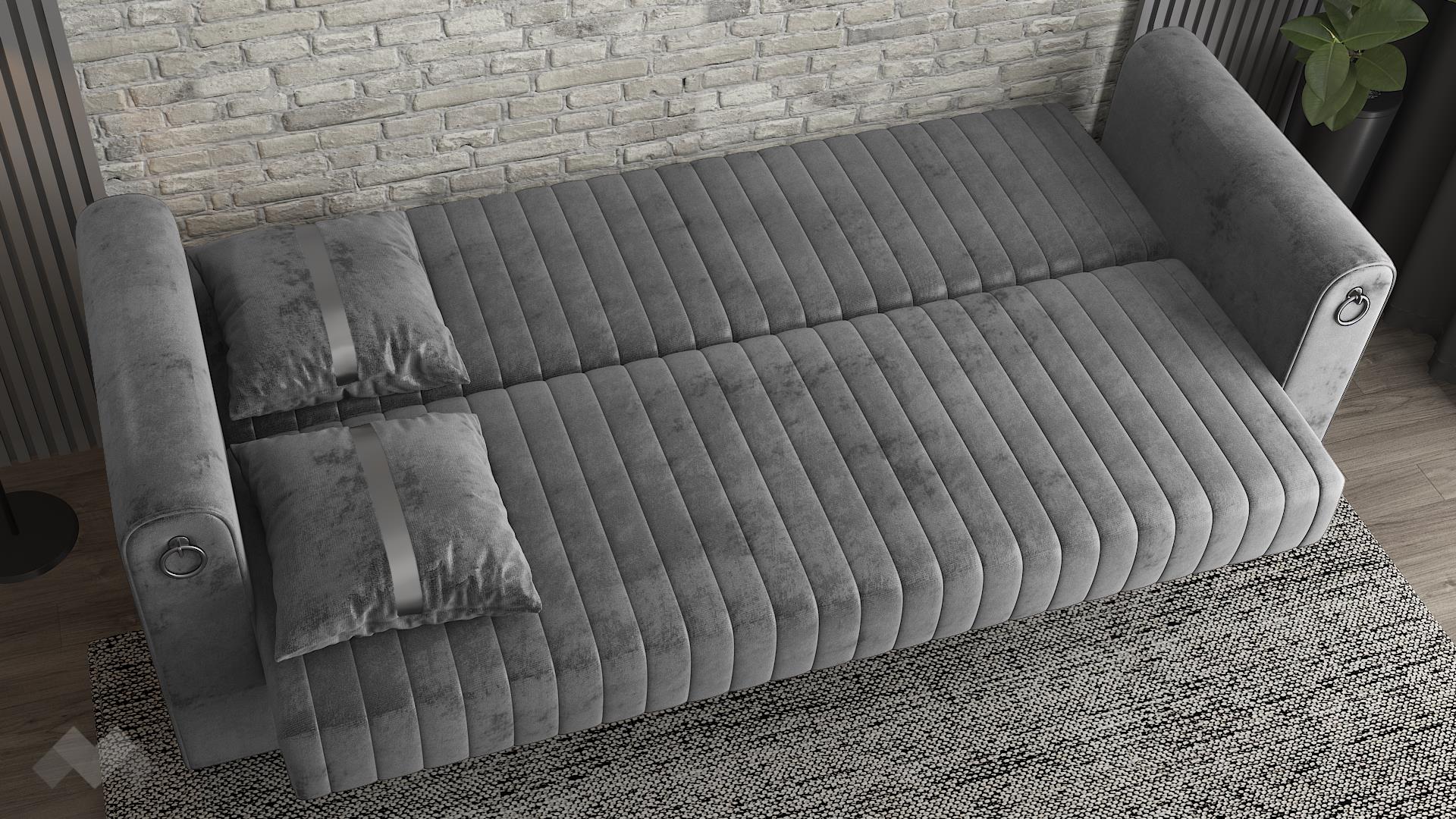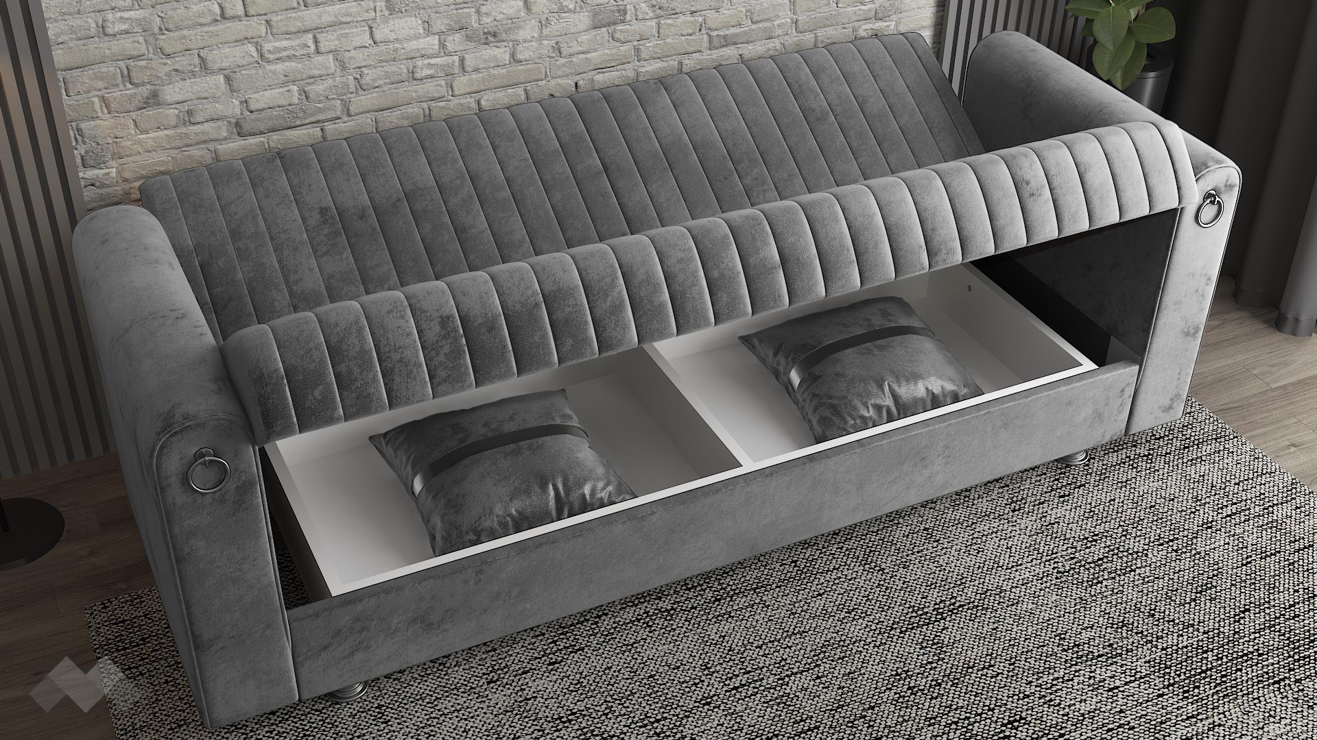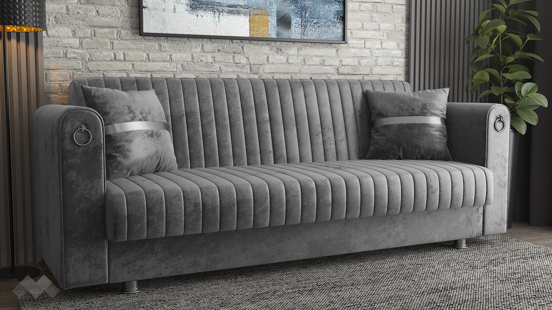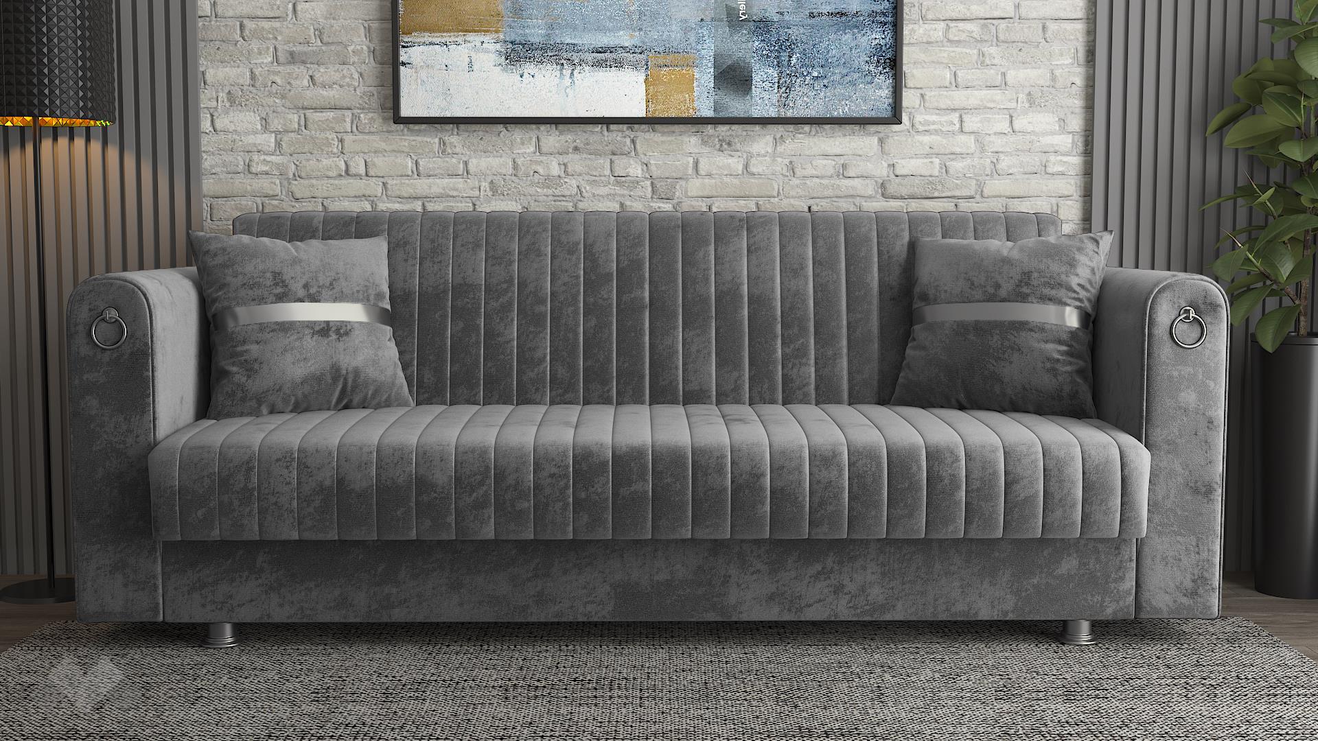 Диван Ваяна впечатлява с модерен дизайн, изискана визия и практични функции. Вертикалните шевове по дамаската, в съчетание с луксозните сребристи акценти по възглавниците, краката и подлакътниците, придават елегантен и завършен вид. Топлият сив цвят и меката на допир дамаска създават уютна атмосфера и стилно присъствие във всеки интериор.