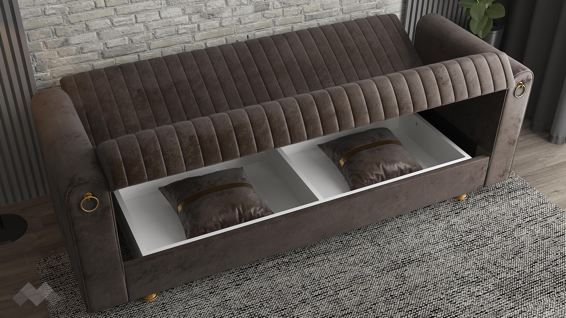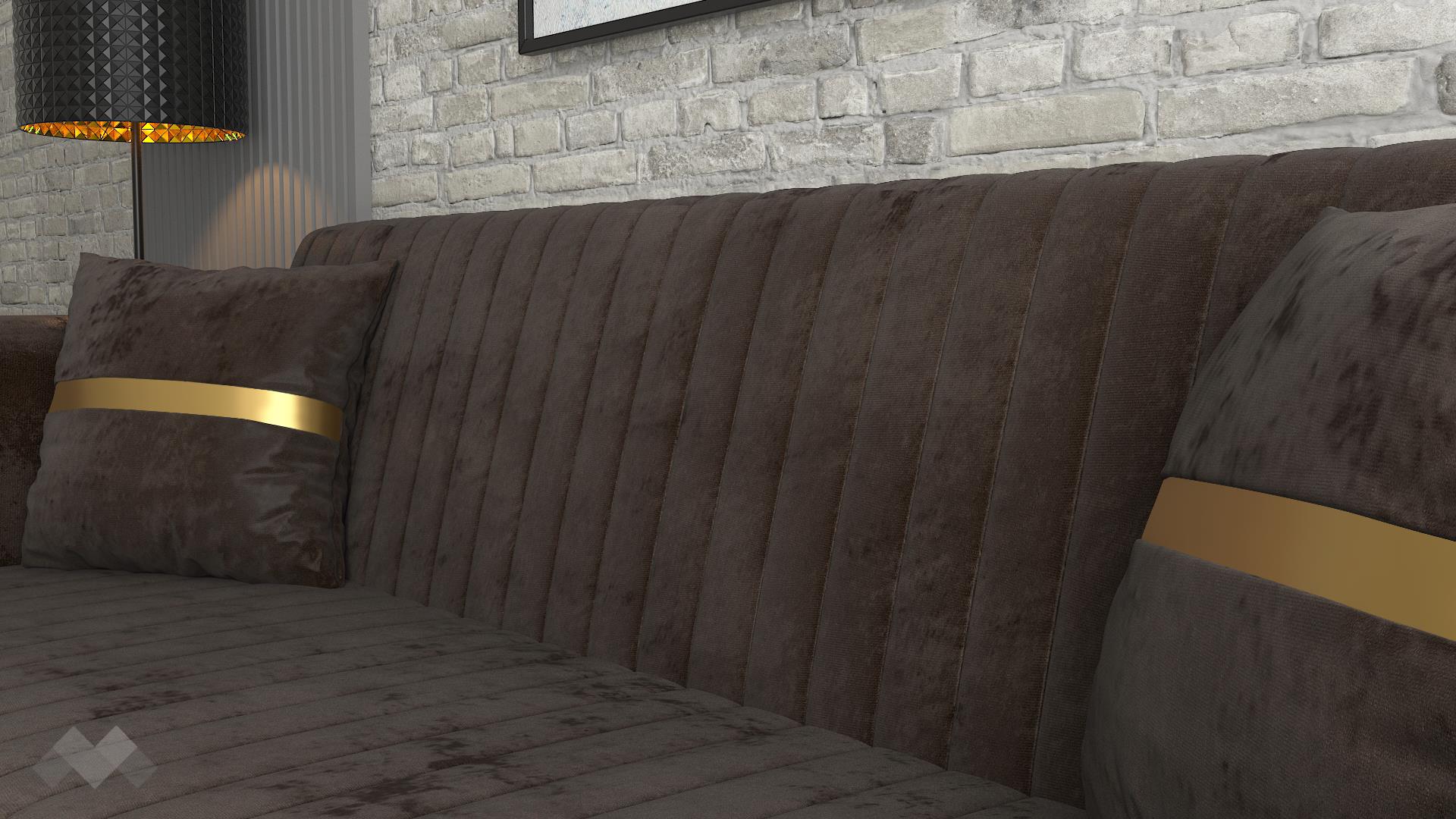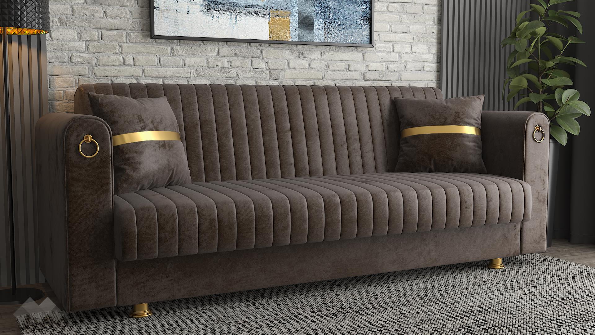 Диван Ваяна впечатлява с модерен дизайн, изискана визия и практични функции. Вертикалните шевове по дамаската, в съчетание с луксозните златисти акценти по възглавниците, краката и подлакътниците, придават елегантен и завършен вид. Топлият кафяв цвят и меката на допир дамаска създават уютна атмосфера и стилно присъствие във всеки интериор.