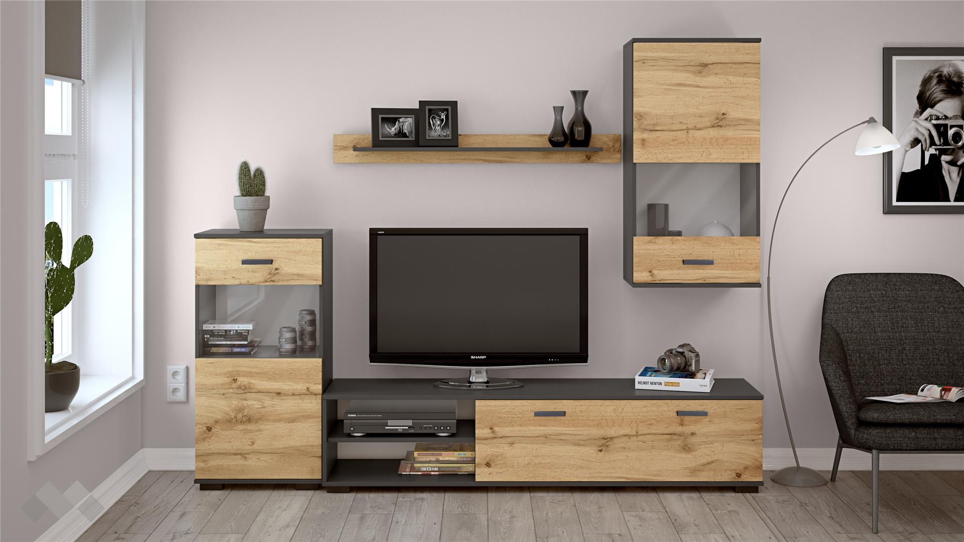 ⭐ Предимства: ✓ 2 отворени рафта ✓ ТВ шкаф ✓ висок шкаф ✓ окачен шкаф ✓ етажерка ✓ модерен дизайн ✓ функционална и практична ✓ качествена изработка ✓ 16 мм ПДЧ