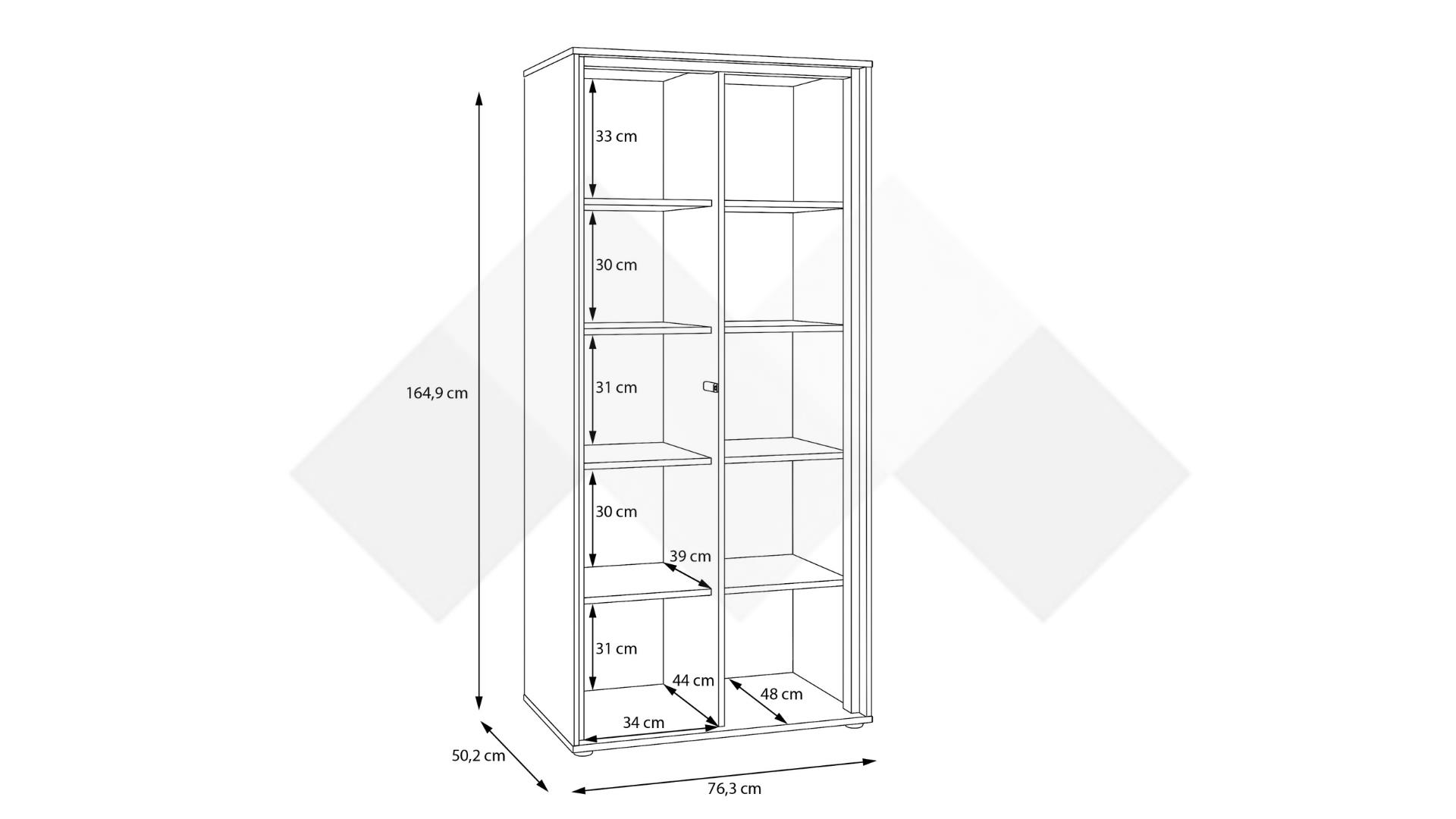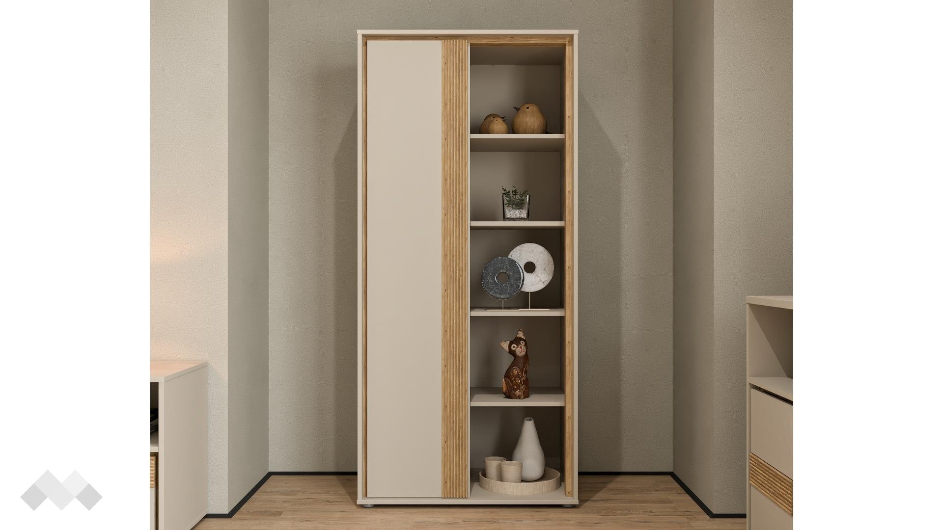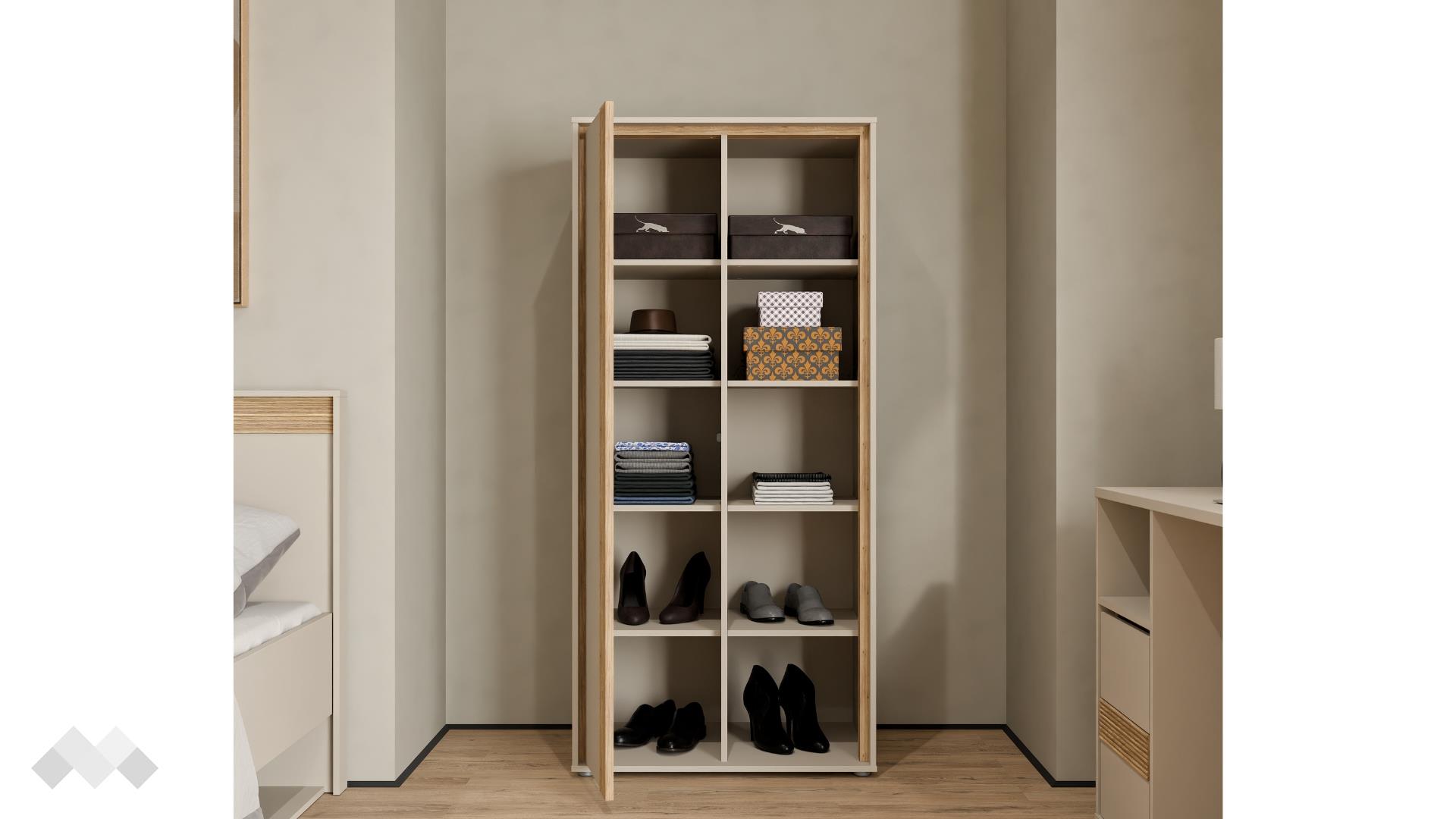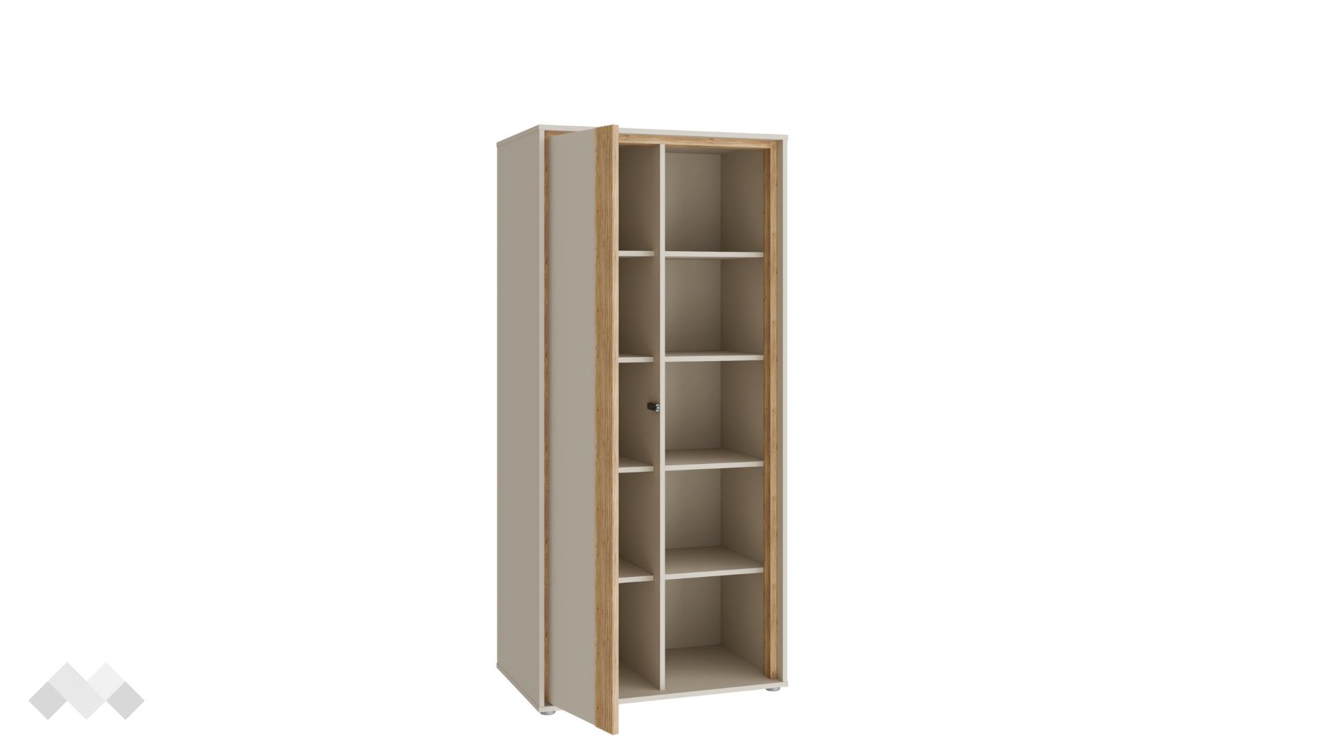 Този шкаф предлага оптимално разпределение на пространството. Разполага с общо 10 рафта, които предоставят изобилие от място за подреждане на книги, декорации, снимки, кутии или други лични вещи. Част от рафтовете са скрити зад врата с пуш механизъм, осигуряваща дискретно съхранение на предмети, които не желаете да бъдат на показ. Отворените рафтове пък са идеални за излагане на любими сувенири и декоративни елементи, привличайки вниманието към тях.
