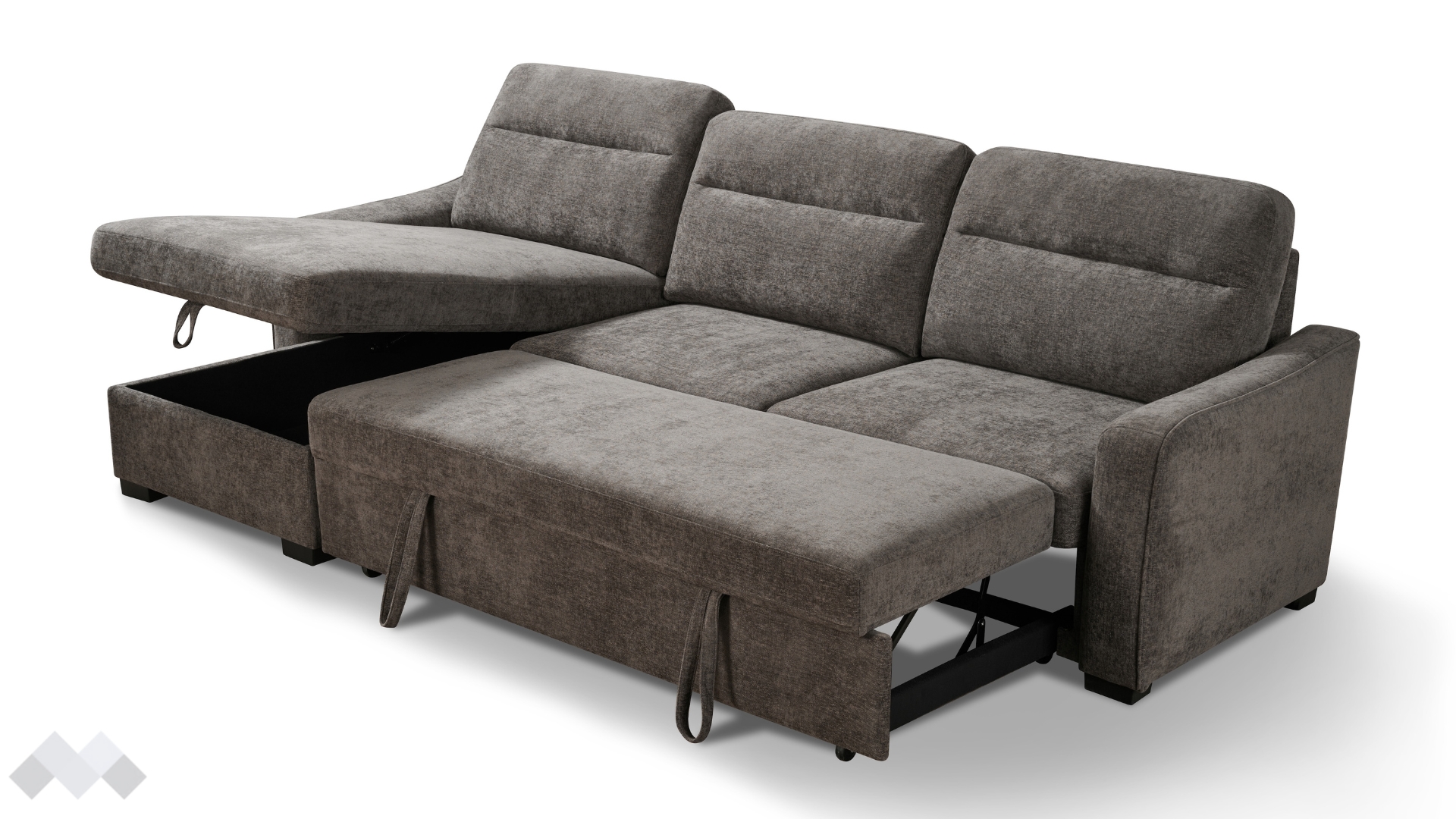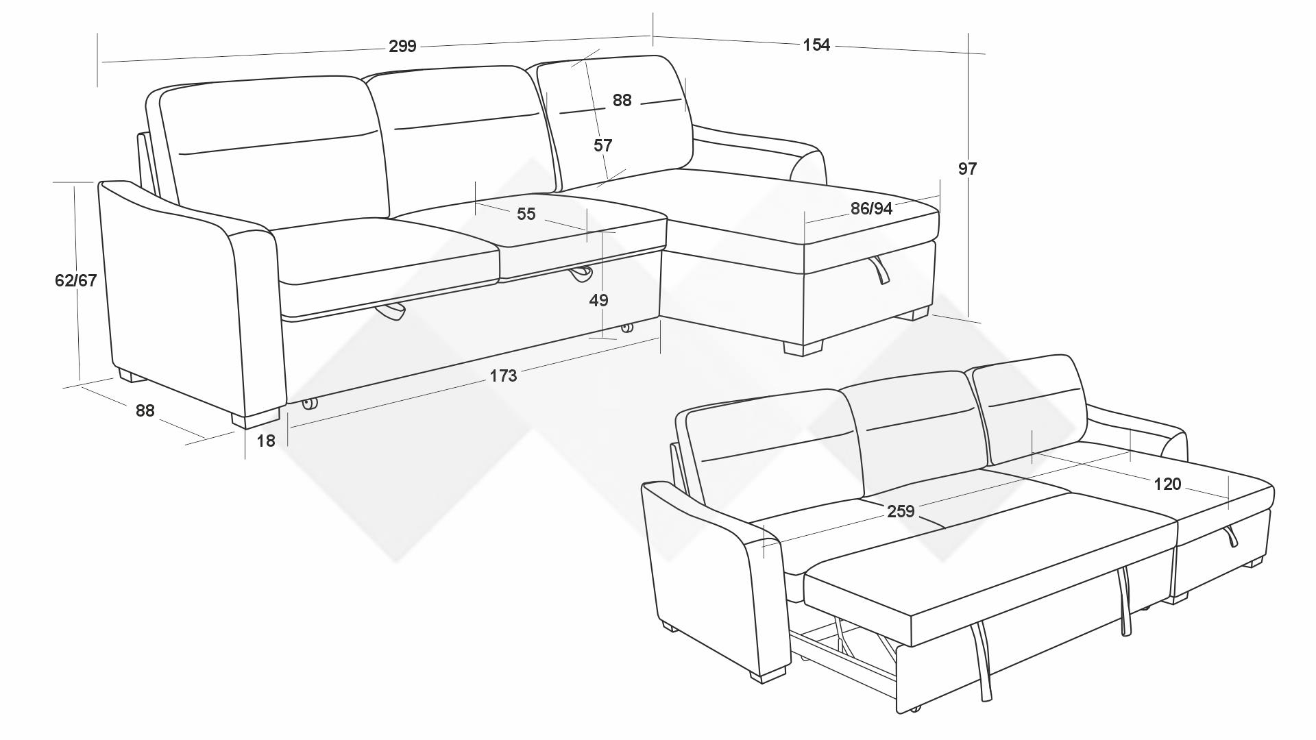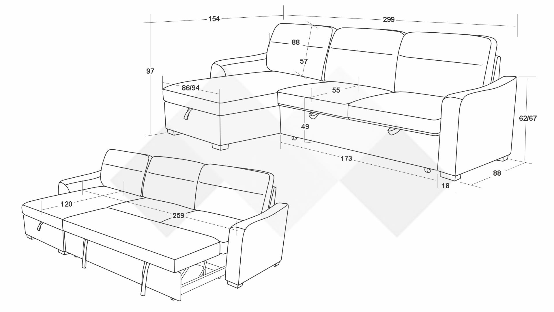 С помощта на подматрачен механизъм диванът се разгъва бързо и без усилие в удобно легло с площ за сън 259/120 см. Само с едно движение можеш да го трансформираш според нуждите си - идеално решение както за ежедневна почивка, така и за гости. Под лежанката е разположена практична ракла, която ти помага да съхраняваш завивки и възглавници и да поддържаш пространството подредено. Облегалните възглавници са със сваляеми калъфи, за да ги поддържаш чисти и свежи.