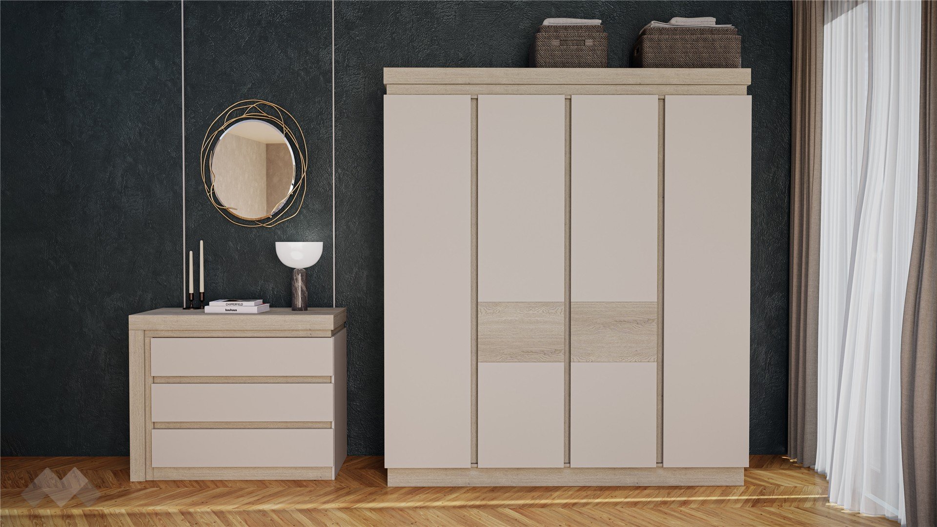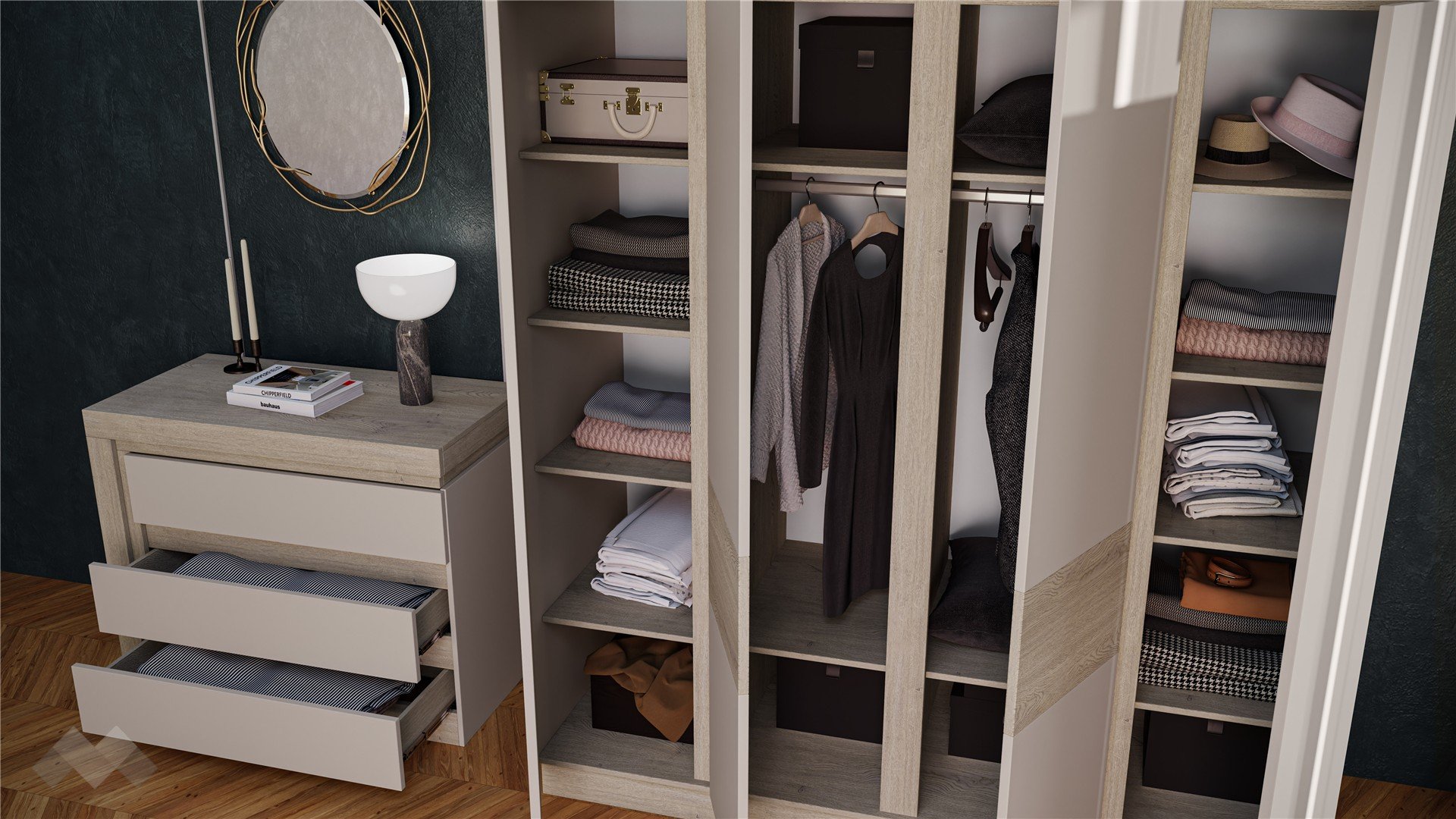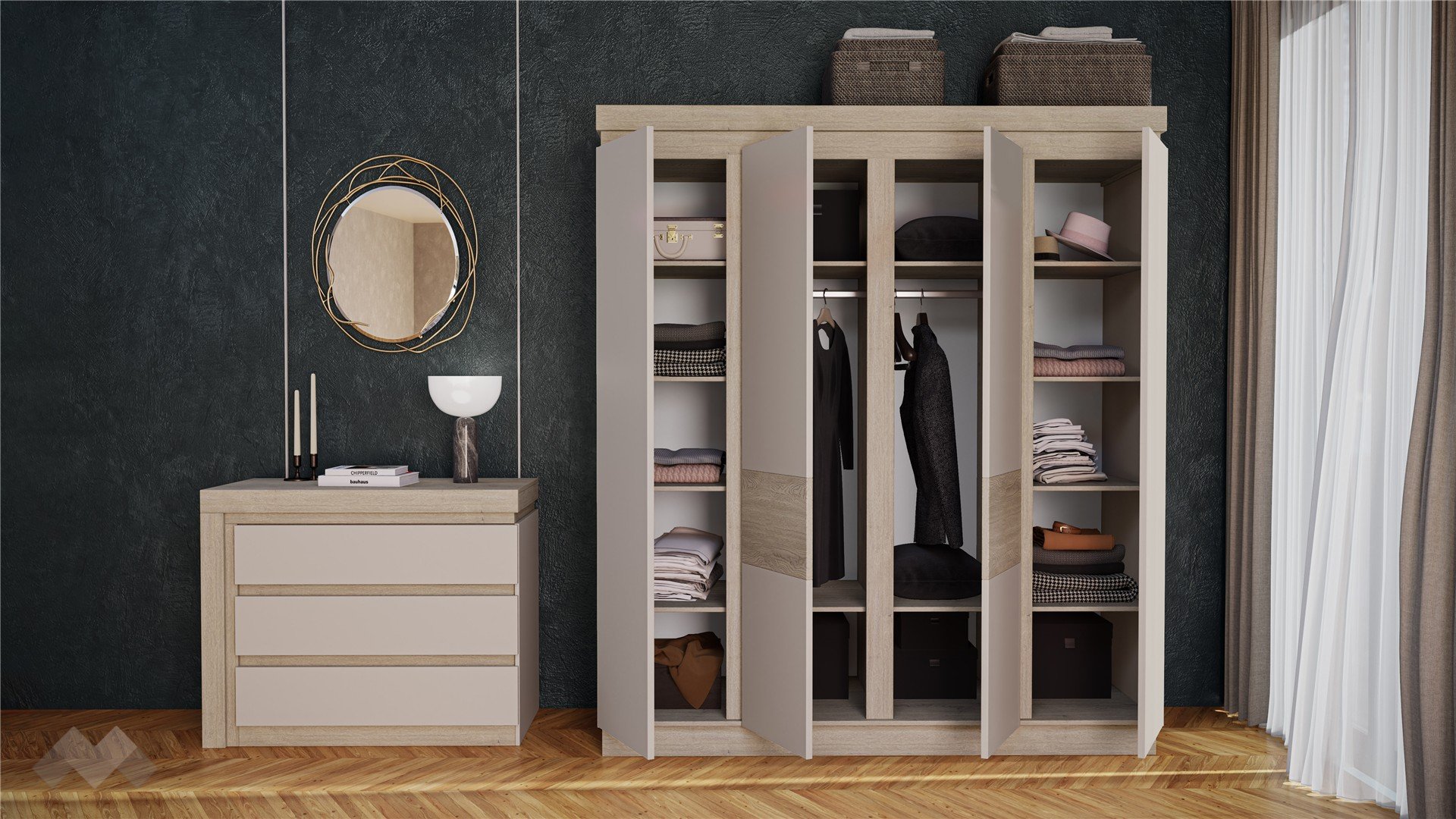 Четирикрилният гардероб ти дава свободата да подредиш дрехите и аксесоарите си така, както обичаш. С помощта на рафтовете и лоста за закачалки всяка вещ ще си има своето място, а подредената спалня носи повече уют и спокойствие в ежедневието.