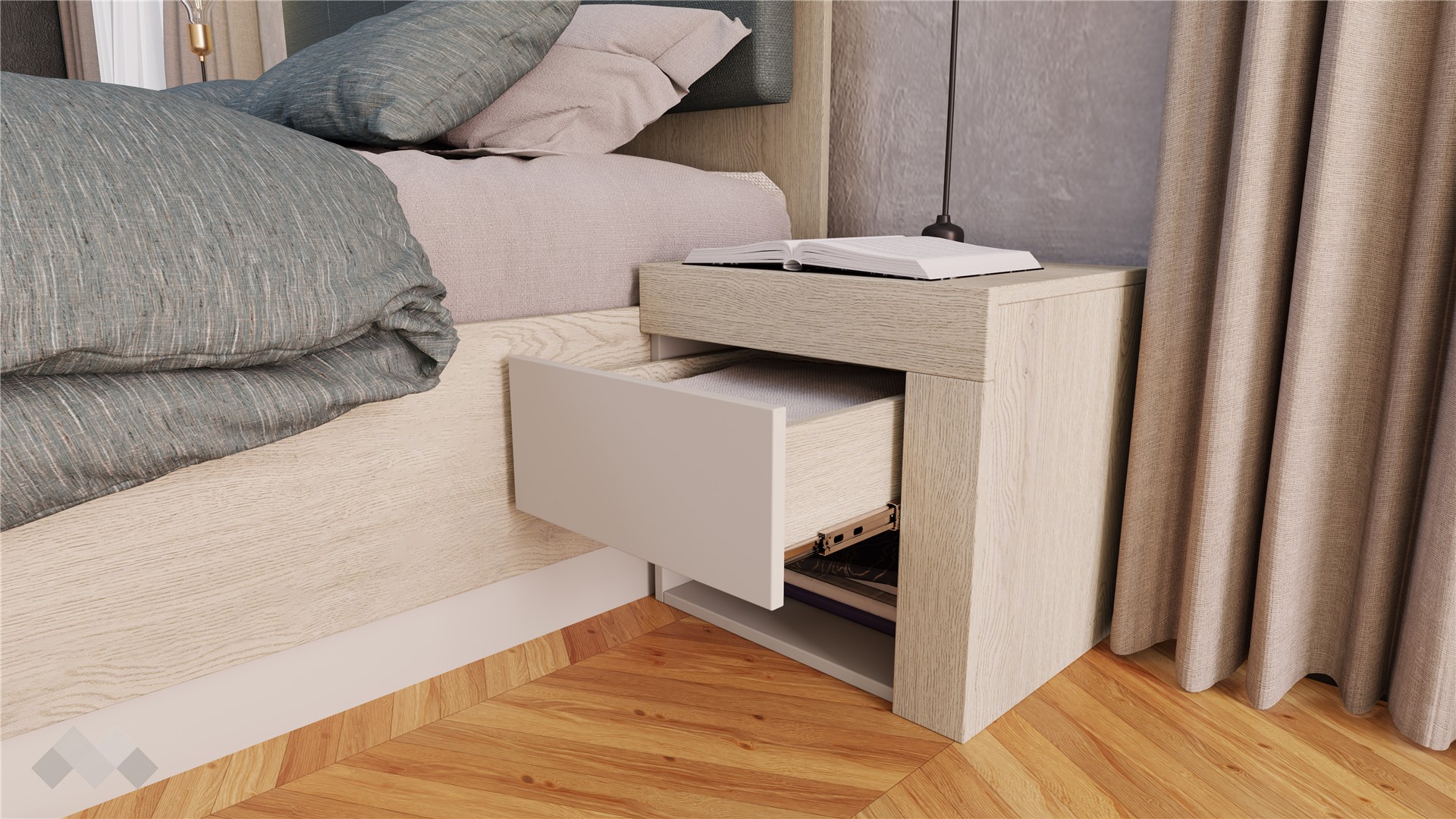 Завършек на комплекта придават двете нощни шкафчета с чекмедже, осигуряващи удобно място за книга, лампа или важни дребни вещи, които искаш да имаш винаги под ръка. Благодарение на сачмените водачи, чекмеджетата се изтеглят леко и стабилно, като издържат и при по-голямо натоварване.