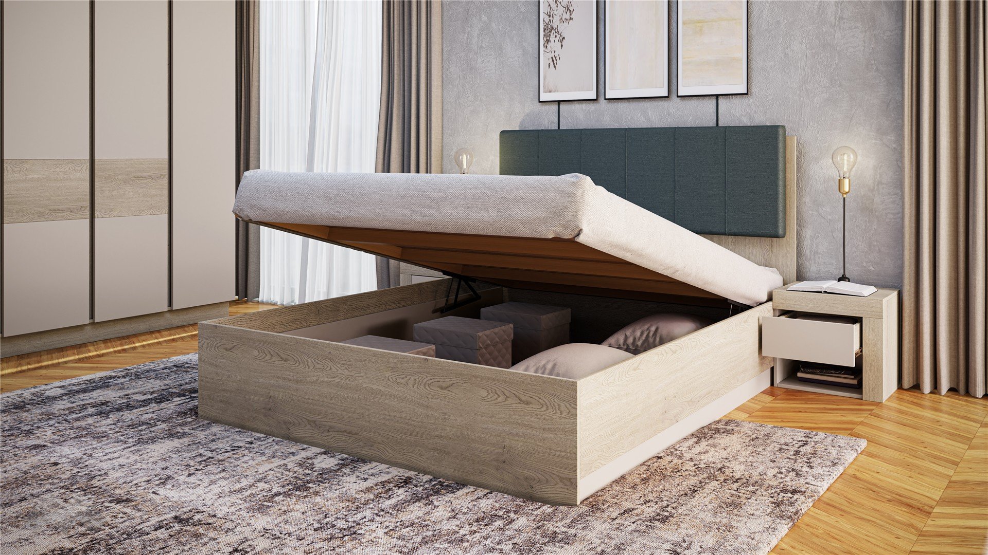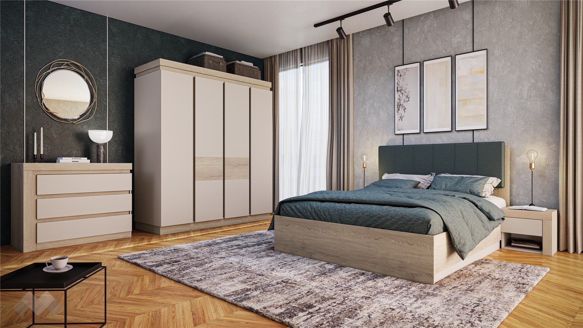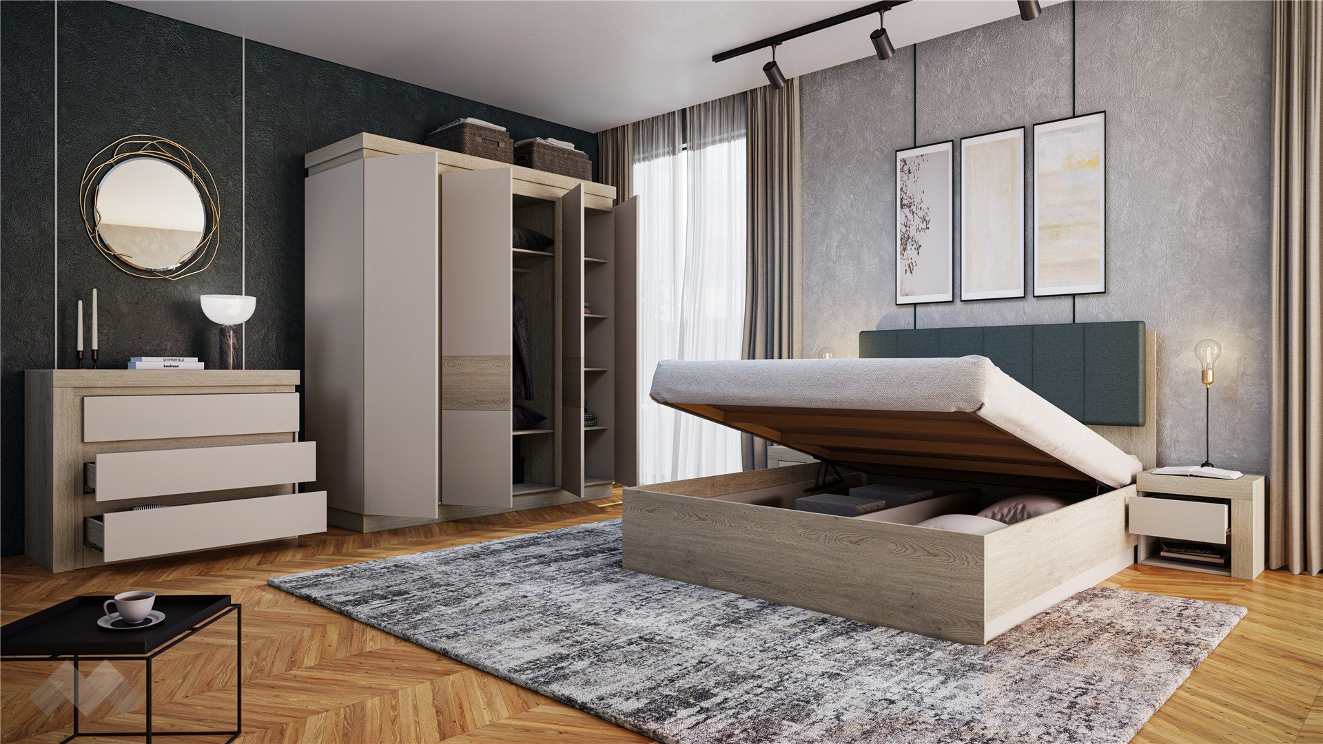 Сърцето на комплекта е леглото с повдигащ механизъм, предназначено за матрак 160/200 см. Тапицираната табла придава изисканост и осигурява комфорт при четене или почивка, а подматрачното пространство ти дава дискретно място за съхранение на завивки, спално бельо или сезонни вещи — идеално, когато искаш да поддържаш ред и простор в спалнята.