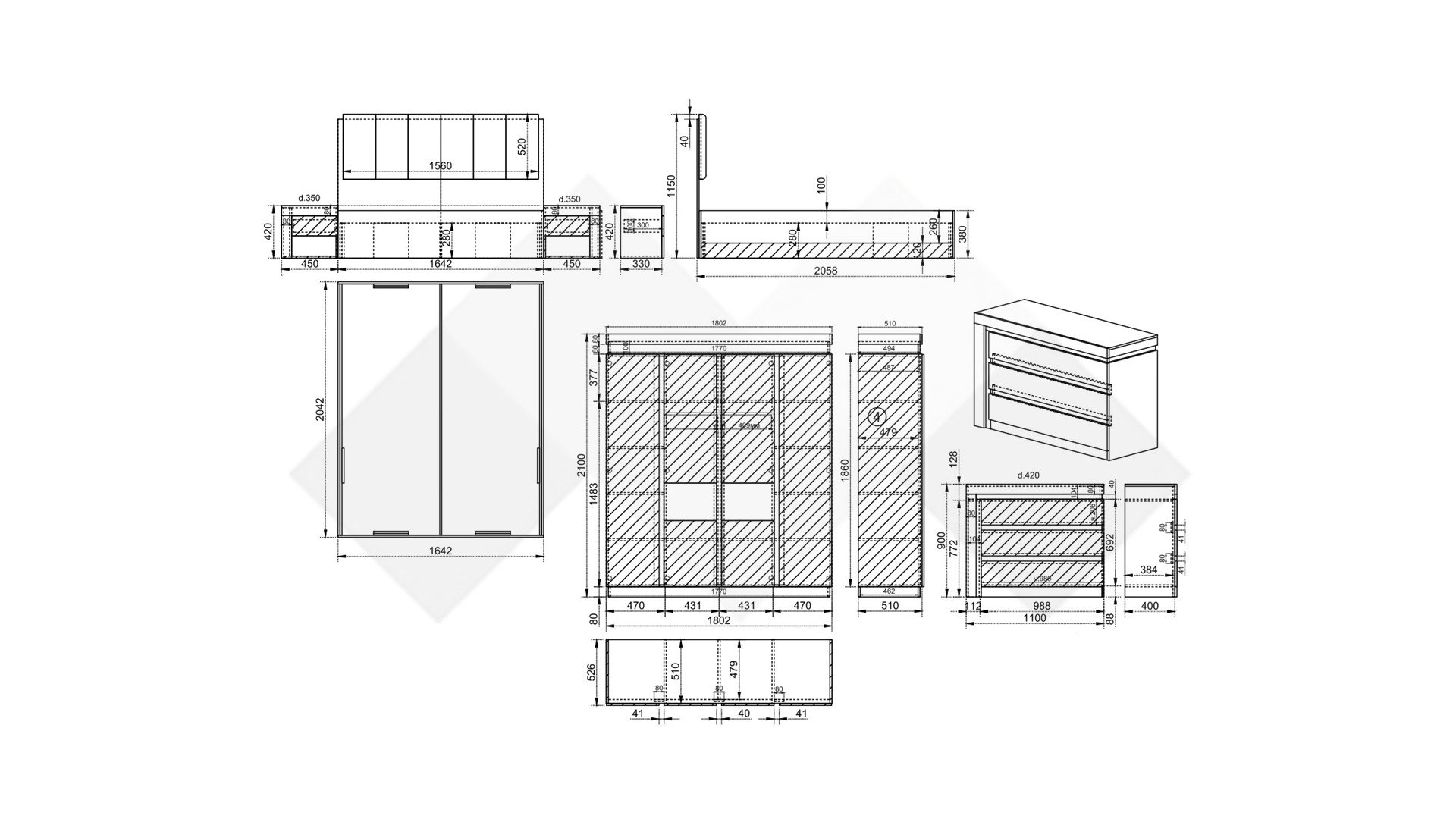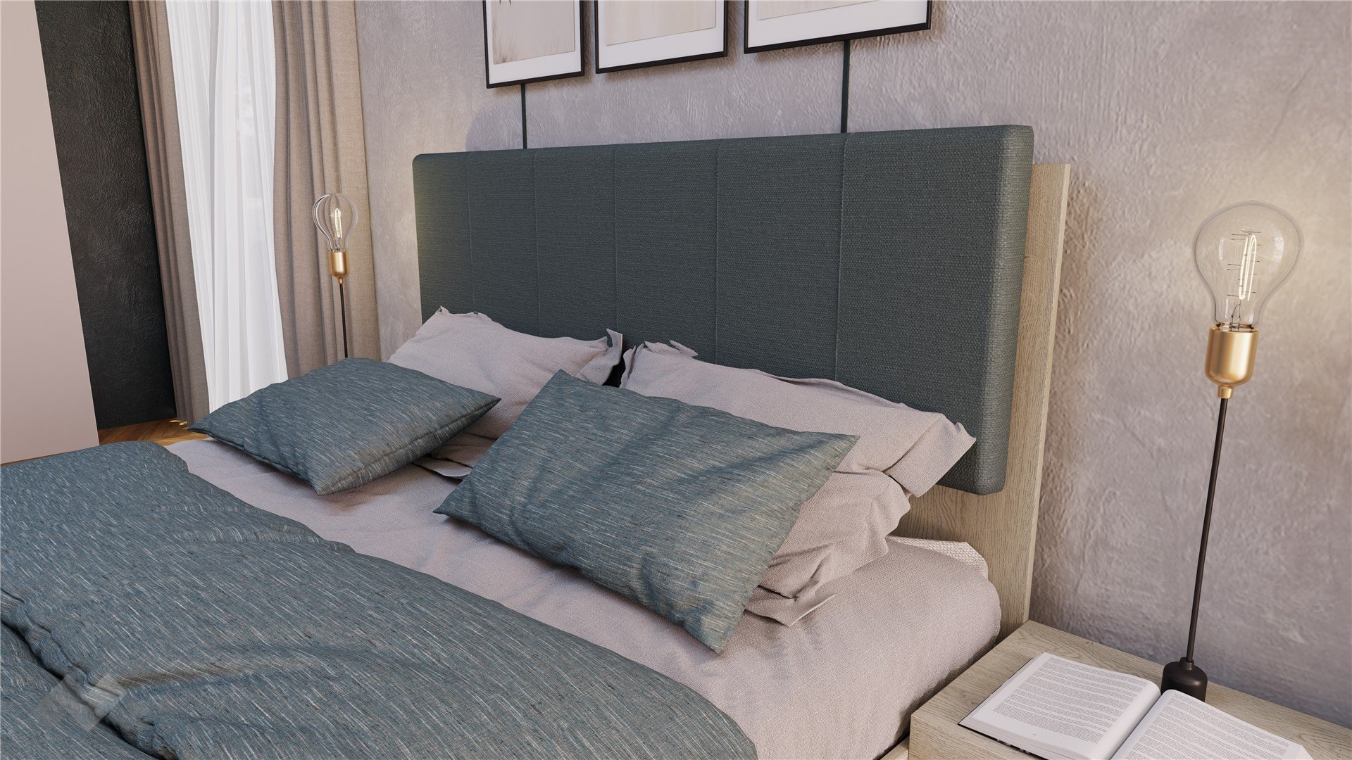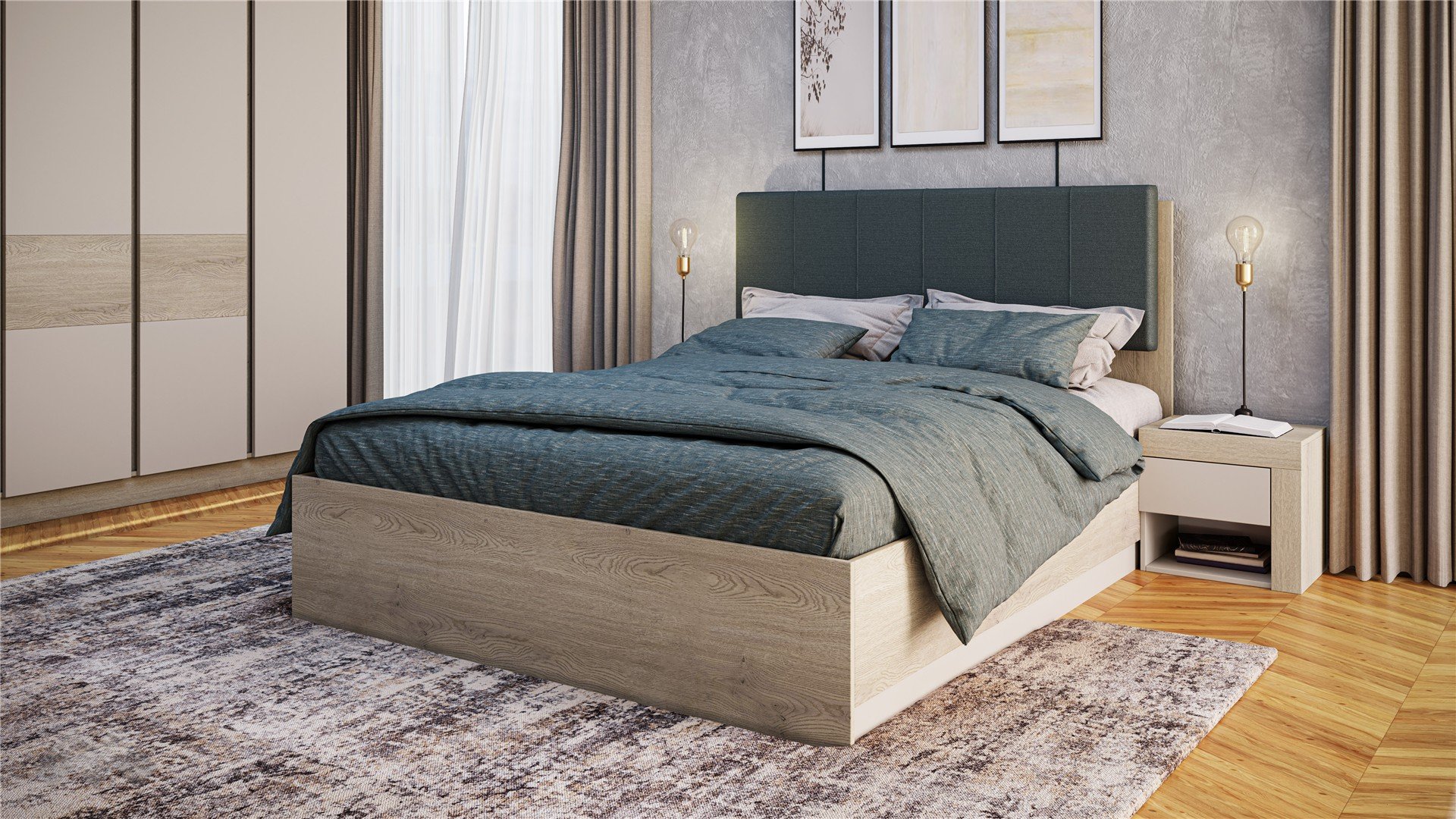 Сърцето на комплекта е леглото с повдигащ механизъм, предназначено за матрак 160/200 см. Тапицираната табла придава изисканост и осигурява комфорт при четене или почивка, а подматрачното пространство ти дава дискретно място за съхранение на завивки, спално бельо или сезонни вещи — идеално, когато искаш да поддържаш ред и простор в спалнята.