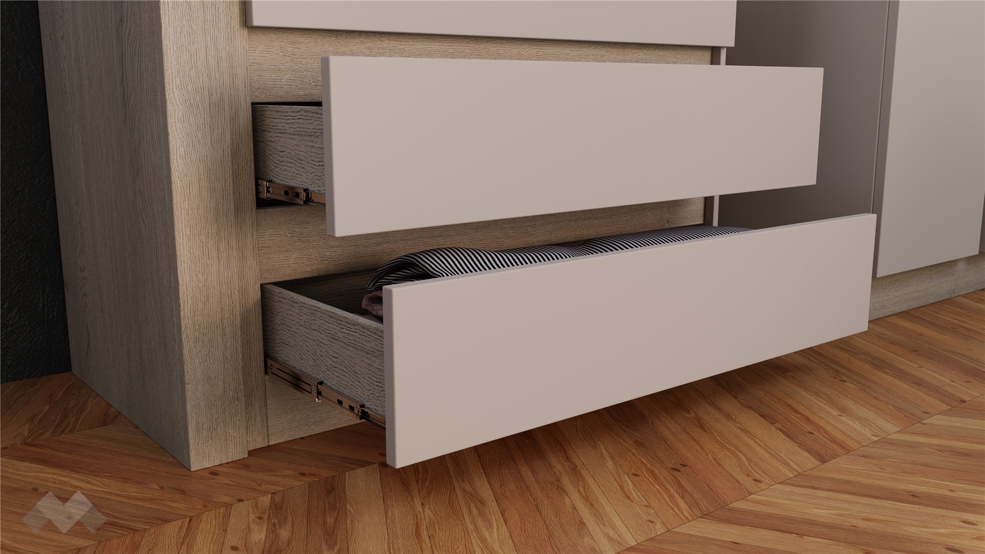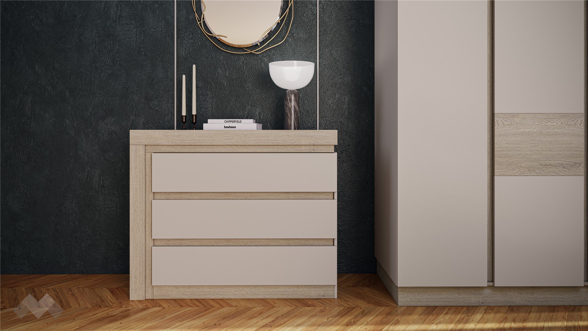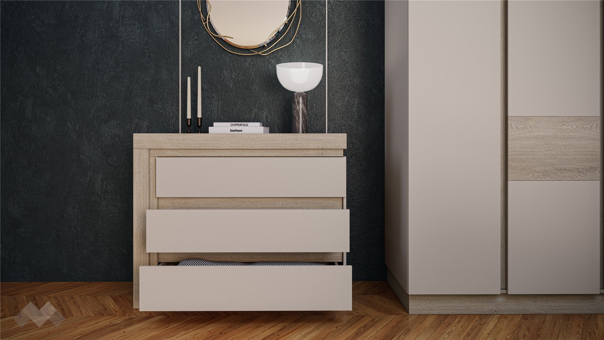 Скринът с три чекмеджета допълва комплекта, предоставяйки достатъчно място за съхранение на лични вещи, козметика и други. Чекмеджетата са снабдени със сачмени водачи с пълно изтегляне, които осигуряват пълен достъп до съдържанието и гарантират дълготрайна устойчивост.