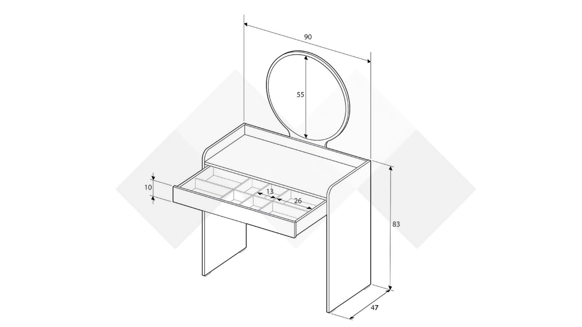 Тя разполага с едно просторно чекмедже с вътрешно разпределение, което само може да ти е в услуга - помага ти да организираш своите вещи. Има и страхотно кръгло огледало, което е незаменим помощник на твоята визия. Плотът е просоторен и ти предоставя още пространство за козметичните ти продукти.