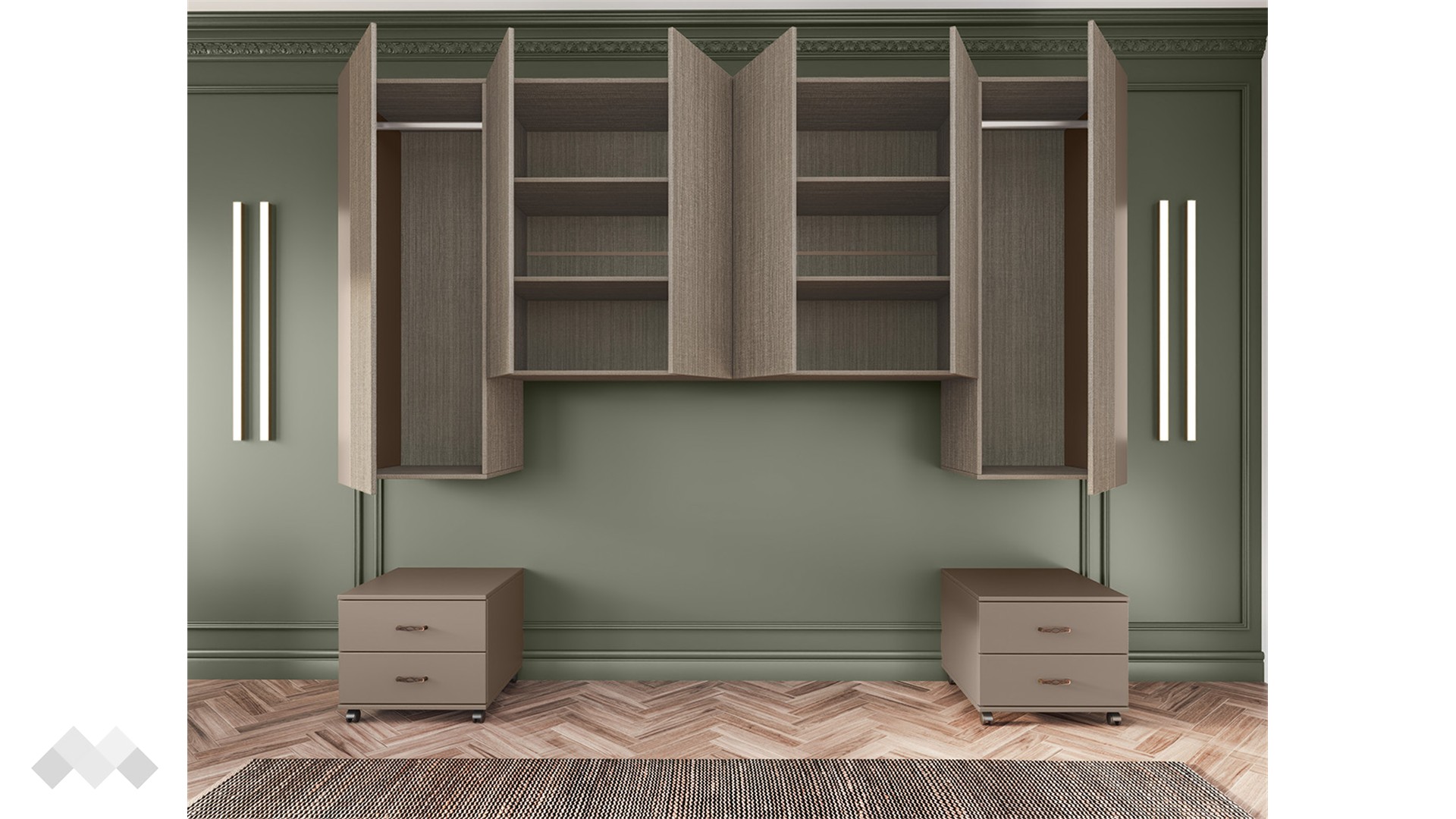 Гардеробът е проектиран така, че да се използва пространството над леглото, предоставяйки максимално удобство и лесен достъп до съхраняваните вещи. С него ще разполагаш с две просторни отделения с лостове, в които можеш да закачиш тоалетите си на закачалки. Сгънатите дрехи, кутии за съхранение или други аксесоари ще намерят място в двете отделения с рафтове.