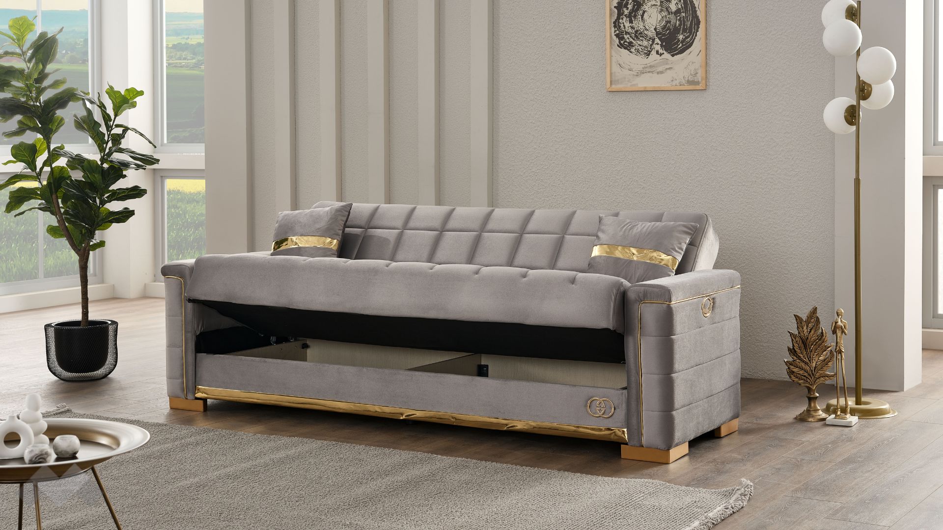 Диван Агра впечатлява с елегантност, изчистени линии и стилна визия. Подлакътниците, обкантени с декоративен златен кант и крака в златно, в комбинация с фигуралните шевове по дамаската и умело подбрания ѝ цвят, го превръщат в истинско интериорно бижу.
