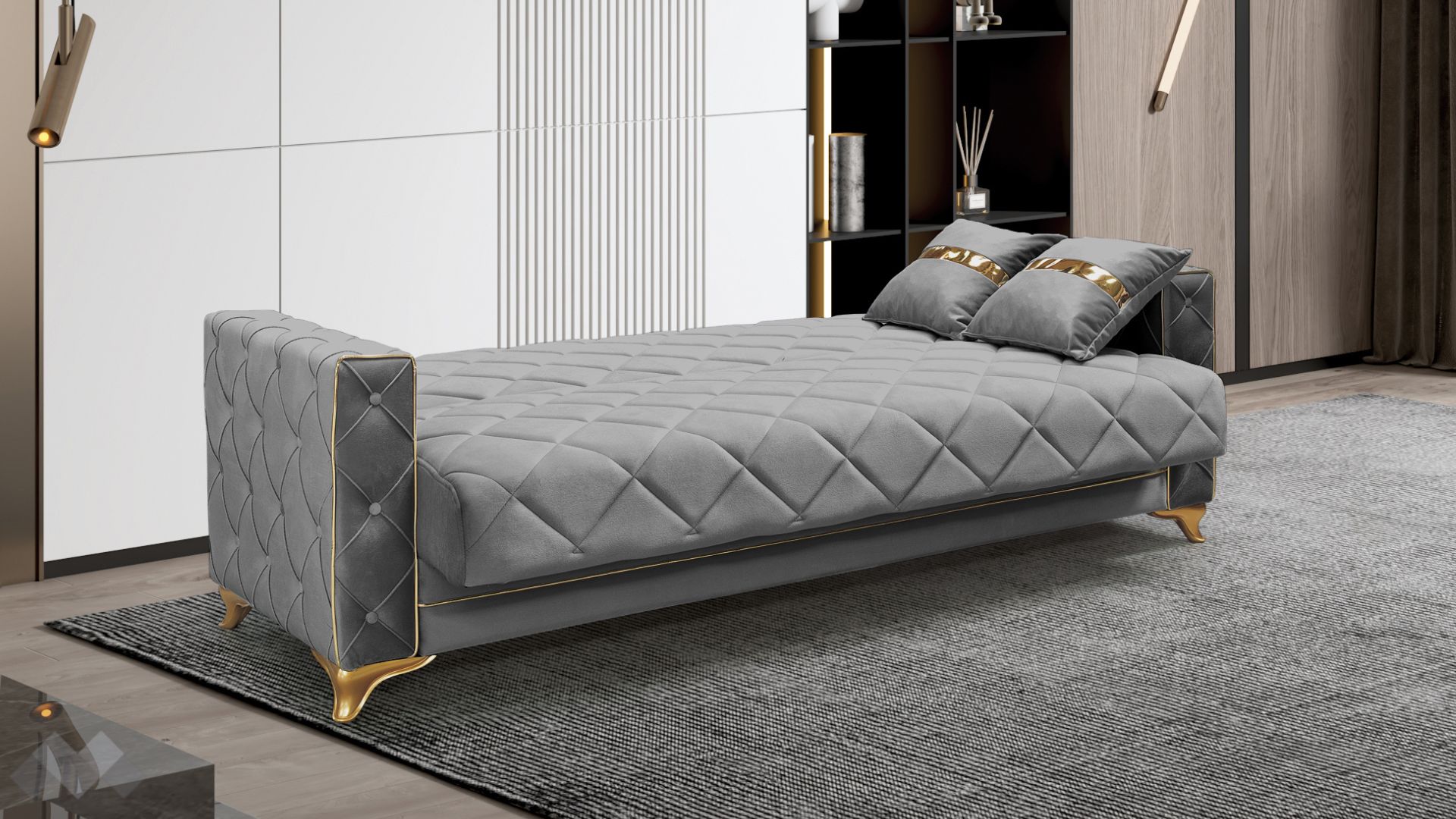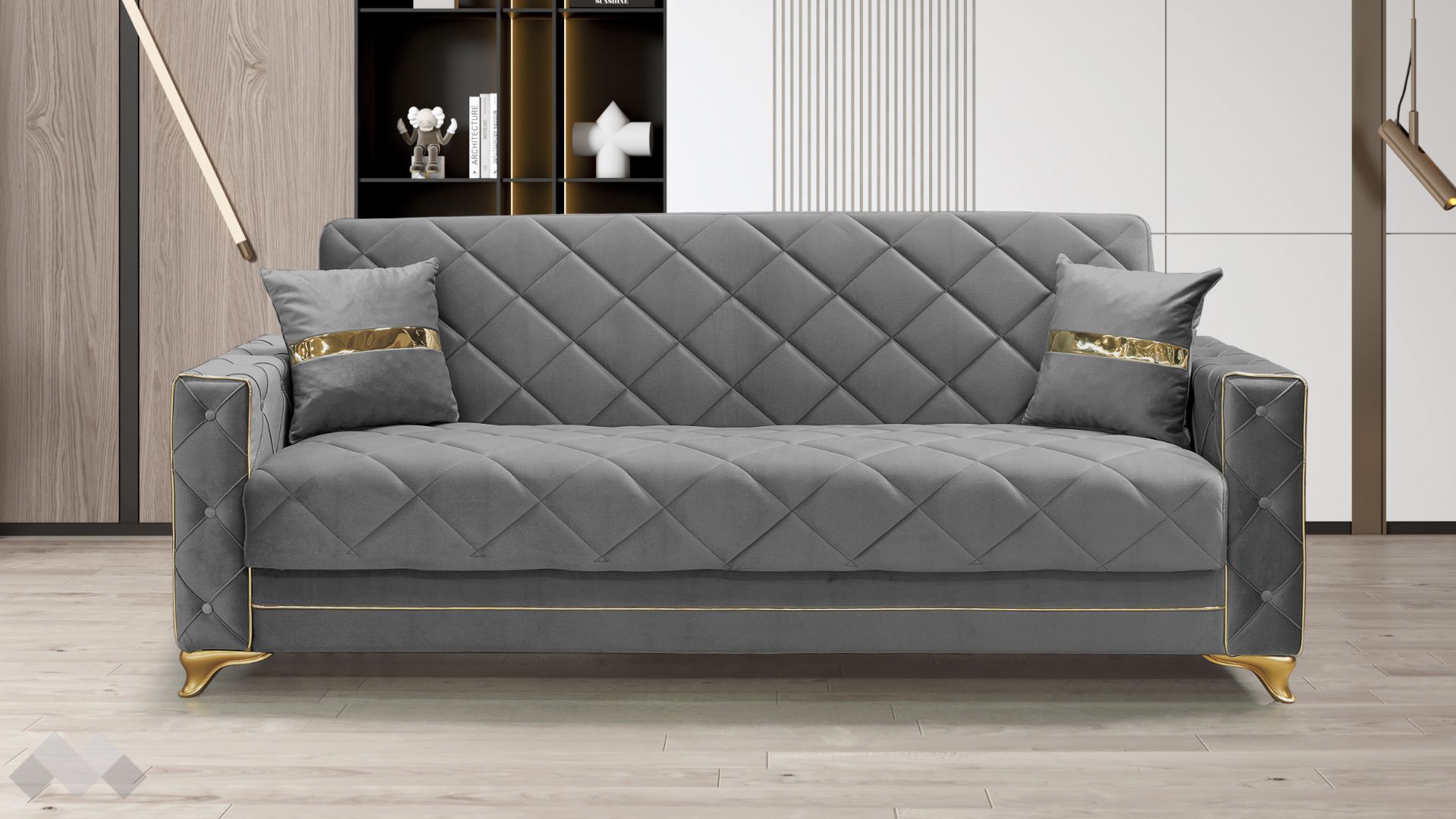 Диван Алмере впечатлява с елегантност, изчистени линии и стилна визия. Подлакътниците, обкантени с декоративен златен кант и крака в златно, в комбинация с фигуралните шевове по дамаската и умело подбрания ѝ цвят, го превръщат в истинско интериорно бижу.