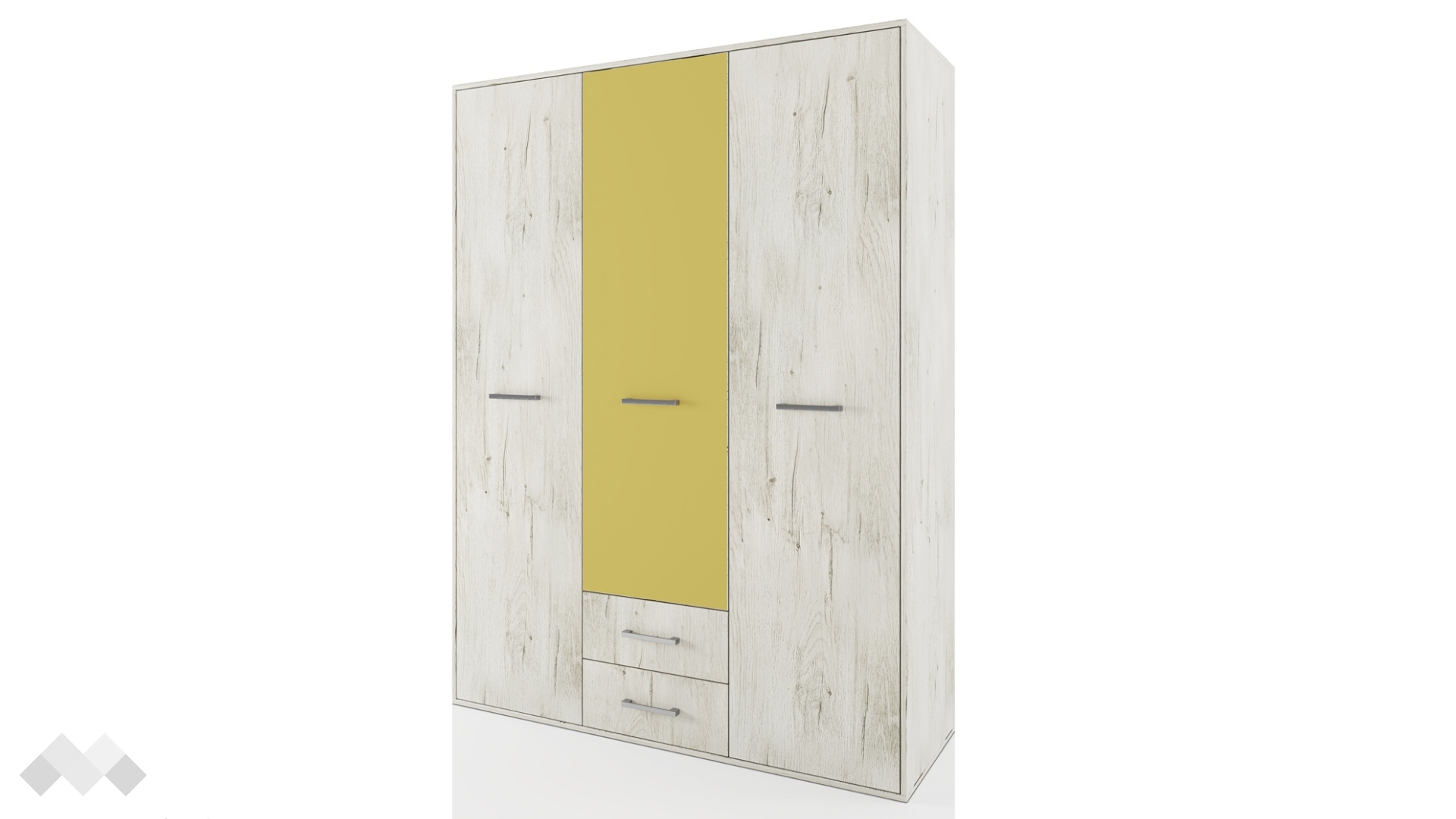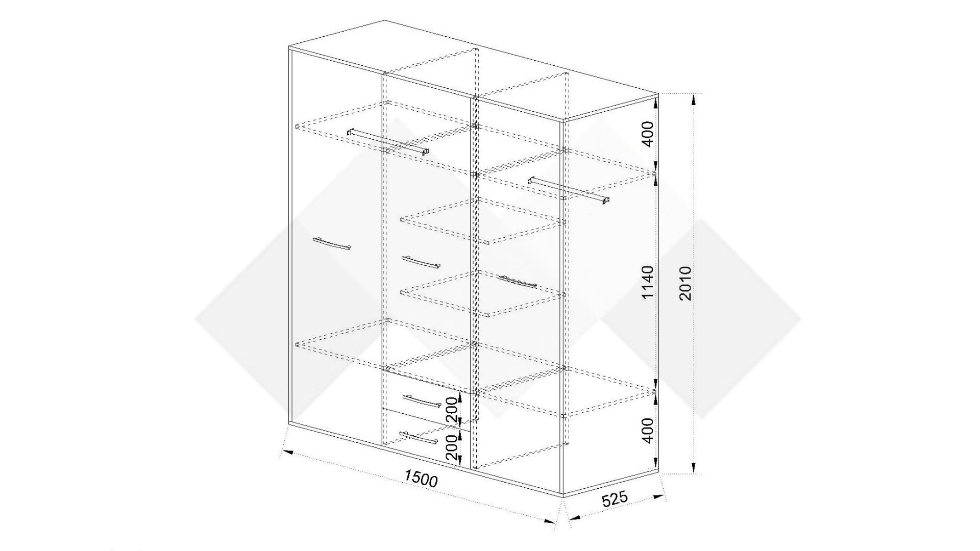 Вътрешното му разпределение е така проектирано, че да имаш бърз достъп до всичко и отговаря на съвременните стандарти за съхранение на дрехи. В две от крилата ще откриеш лост за закачалки, а в третото крило са разположени 4 удобни рафта, на които да разположиш сгънати дрехи, кутии или други принадлежности. Двете чекмеджета са удобни за съхранение на бельо, аксесоари или дрехи от деликатни материи.