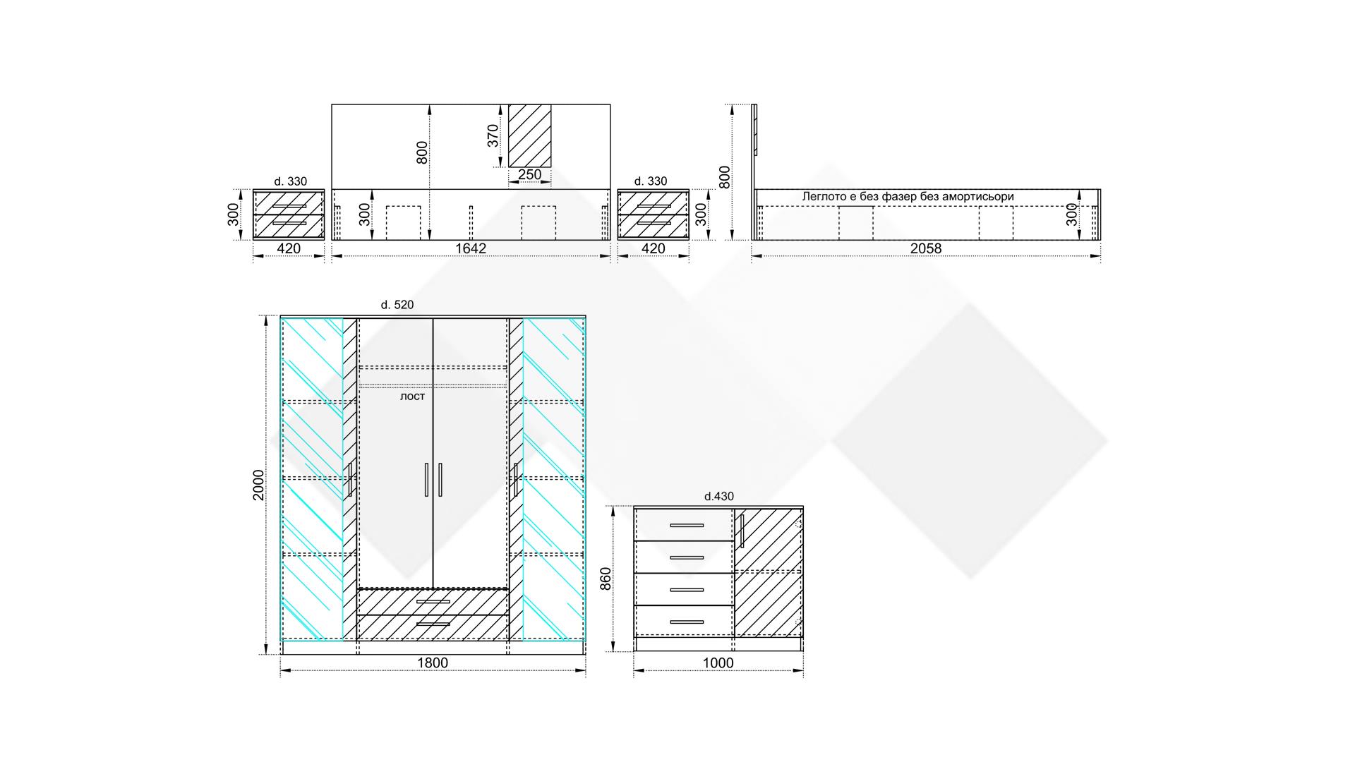 Спалният комплект е без включен механизъм за повдигане на матрака. Ако желаеш да използваш пространството под матрака като допълнително място за съхранение, може да закупиш комплект механизъм за повдигане на матрака.