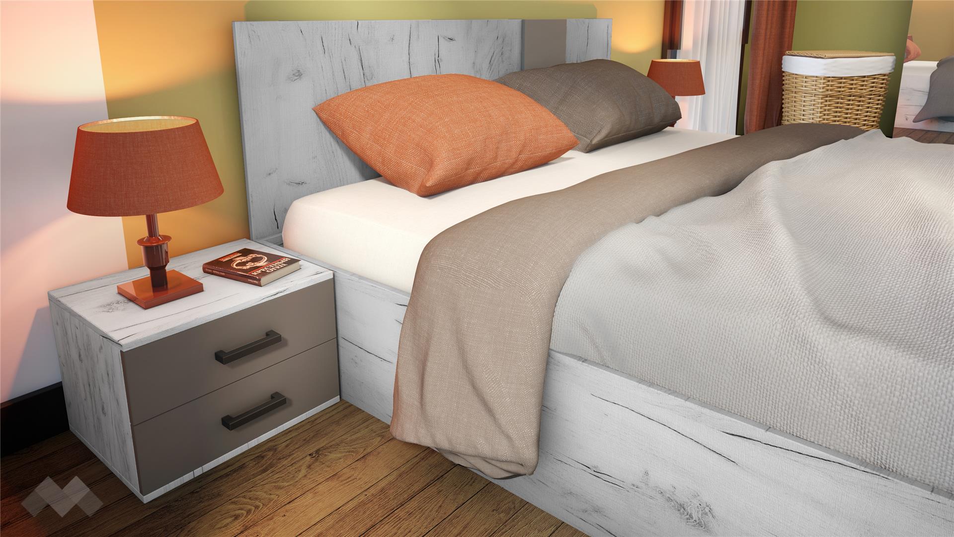 Спалнята е достатъчно голяма, за да ти предостави нужното пространство и комфорт на спане. Таблата ѝ е изпълнена в цвят дъб крафт бял и е ефектно декорирана с акцент в цвят базалт. Двете нощни шкафчета разполагат с по две удобни чекмеджета. Те са перфектното място за кокетна нощна лампа, любимата книга, фотография или място да поставиш мобилния, за да е винаги под ръка, когато ти потрябва.