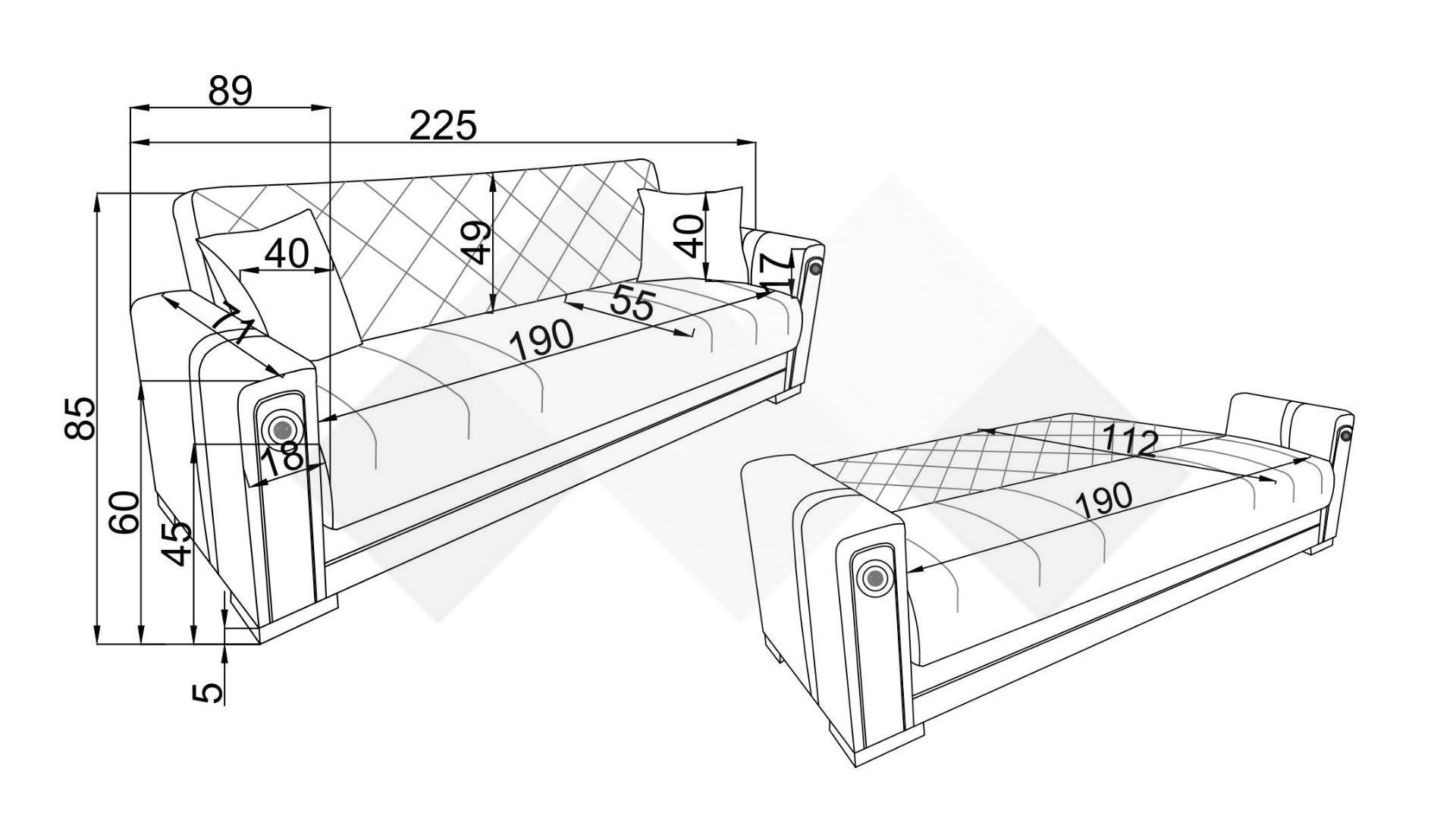 Диванът има здрава конструкция с бонел пружина, отличаваща се с устойчивост за дълъг период на употреба.