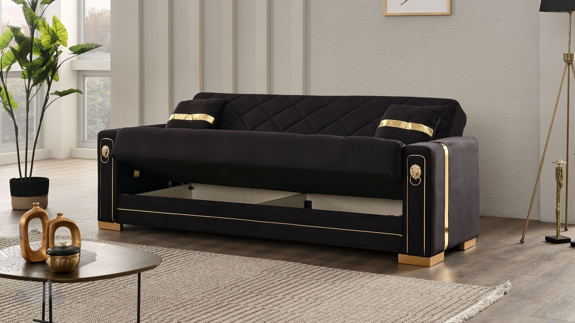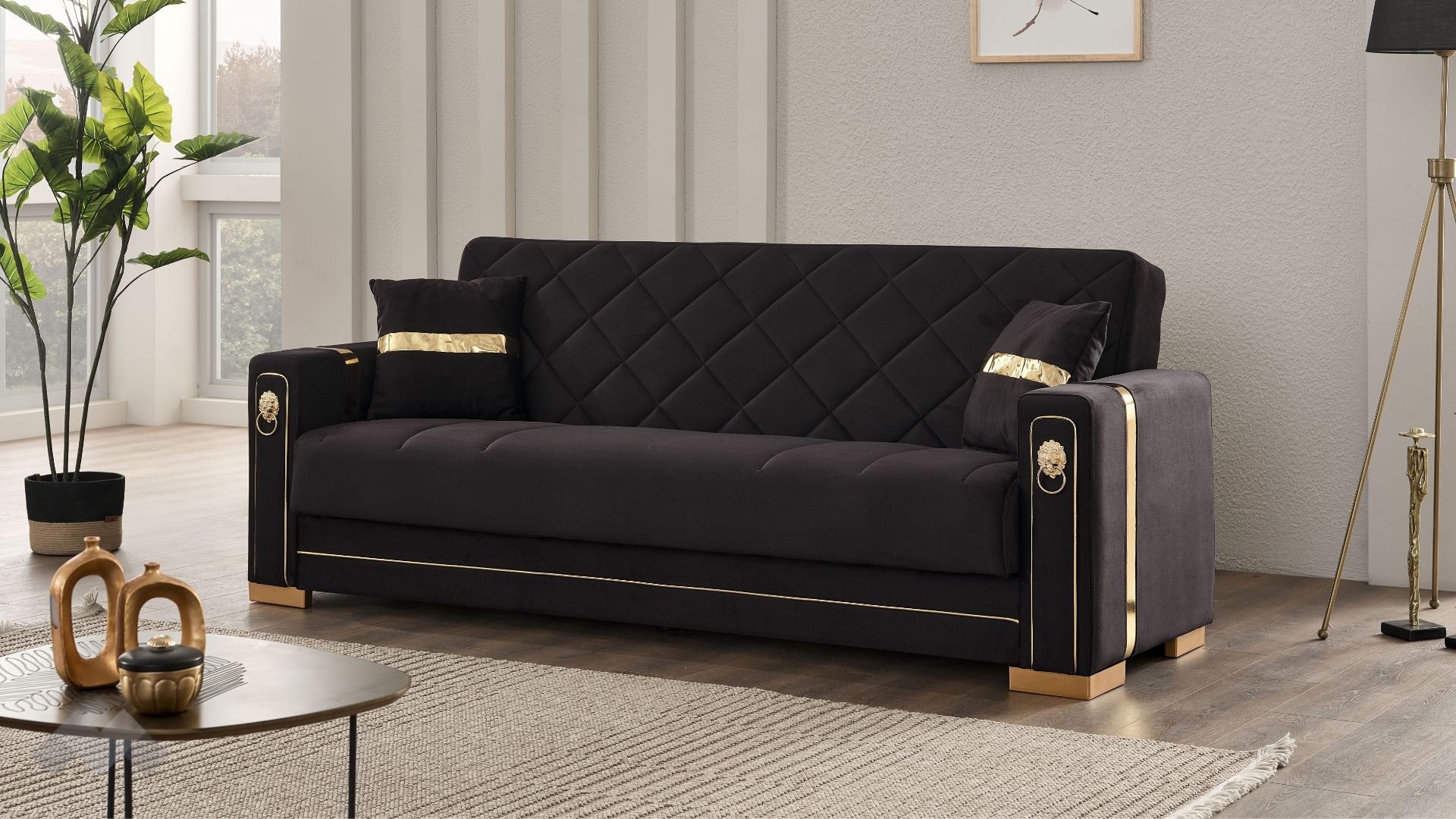 Диван Анталия впечатлява с елегантност, изчистени линии и стилна визия. Подлакътниците, обкантени с декоративен златен кант и крака в златно, в комбинация с фигуралните шевове по дамаската и умело подбрания ѝ цвят, го превръщат в истинско интериорно бижу.