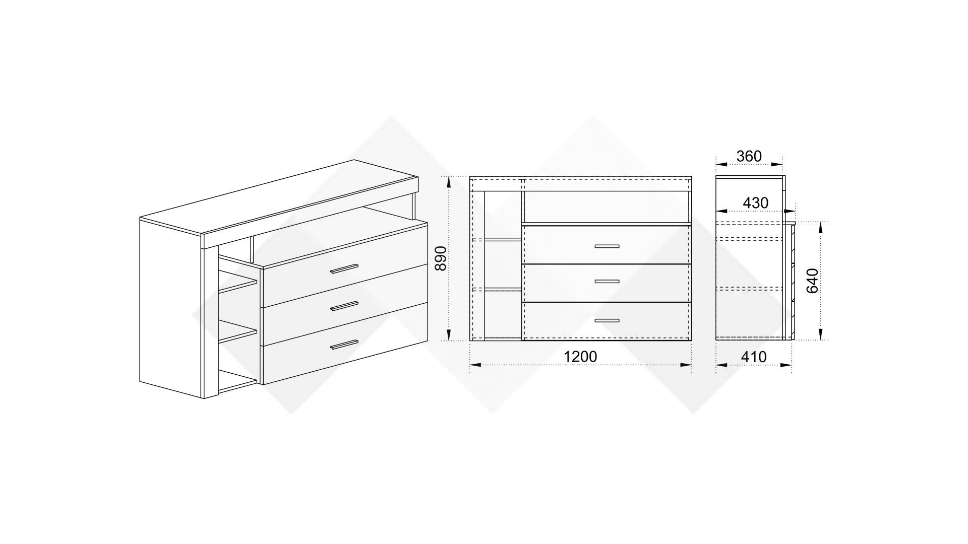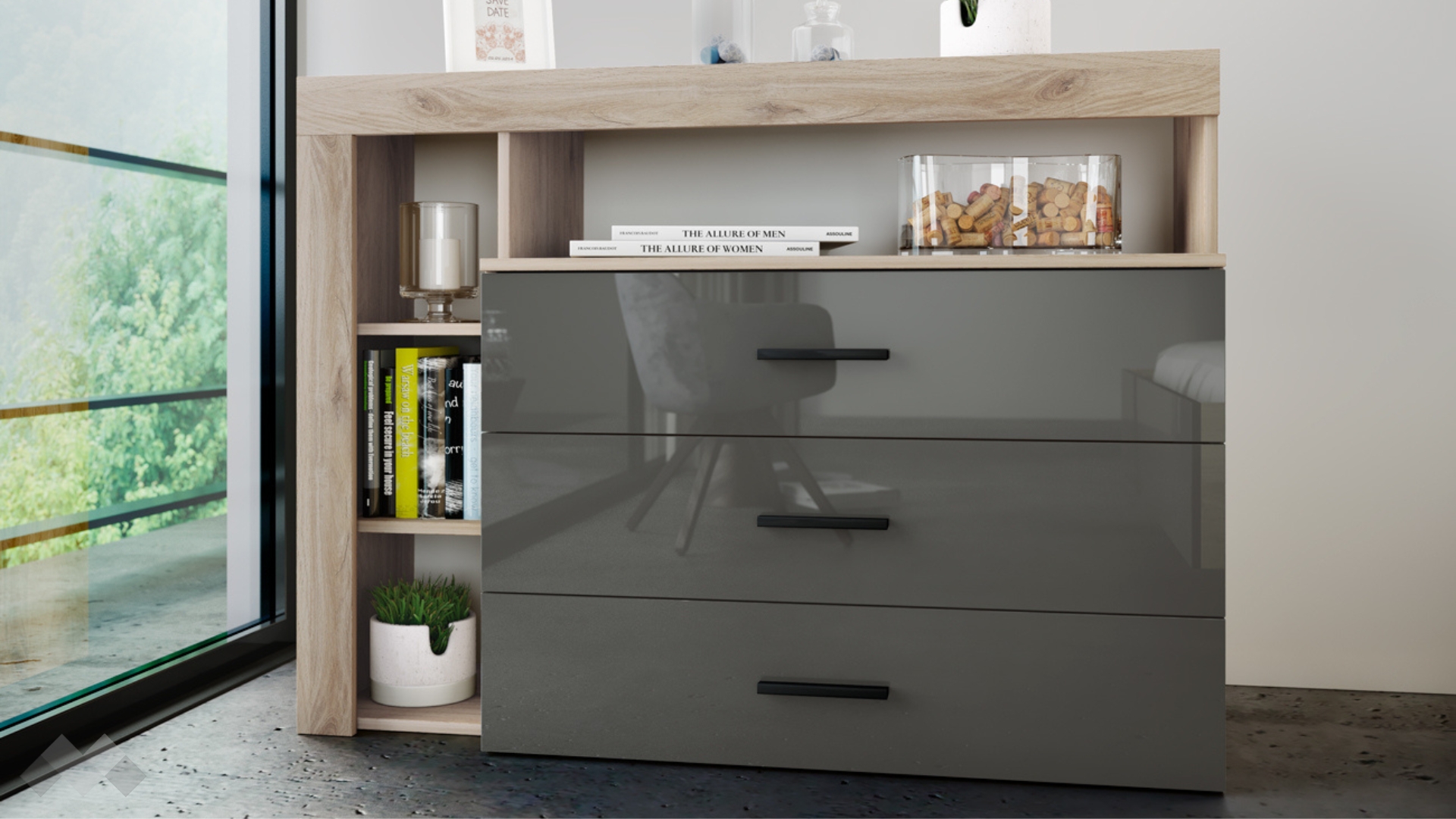 На твое разположение са три чекмеджета и две отворени етажерки с общо три рафта. Удобното му разпределение го прави мултифункционален. Той може да бъде чудесно допълнение към всекидневната, където да ти послужи за организиране на всички вещи, за които не намираш място в секцията. Можеш да го поставиш и в спалнята, където да ти предостави допълнително място за дрехи, аксесоари, малки ел. уреди или други необходими за теб неща. На рафтовете можеш да подредиш декорации, книги, козметика, бижута или други вещи, които да ти бъдат винаги под ръка.