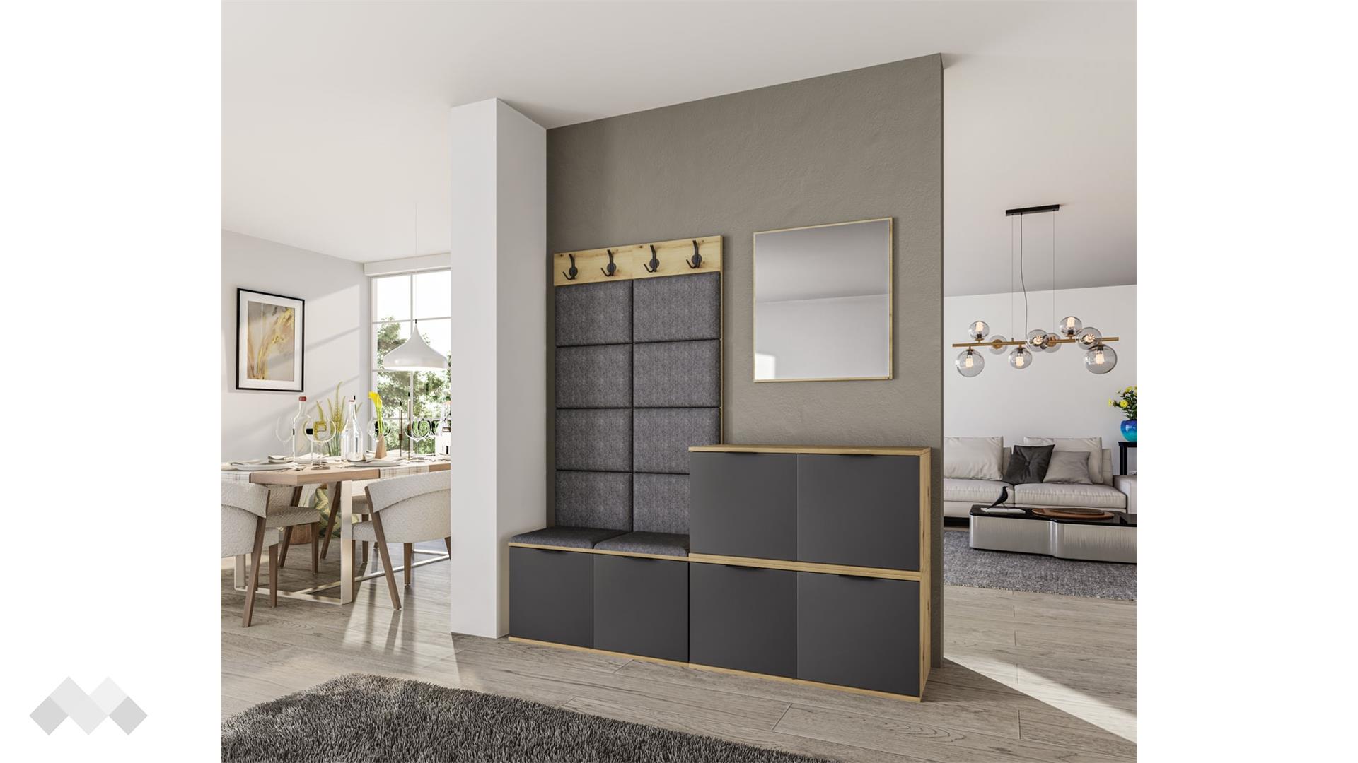 Портманто Антъни разполага с тапицирано пано с четири двойни практични закачалки за якета, палта и други връхни дрехи, които носиш ежедневно. Всеки от шестте шкафа е разделен на две, посредством рафт, за да имаш повече място за обувки. Върху два от тях можеш да поседнеш удобно, докато се обуваш, защото са тапицирани.