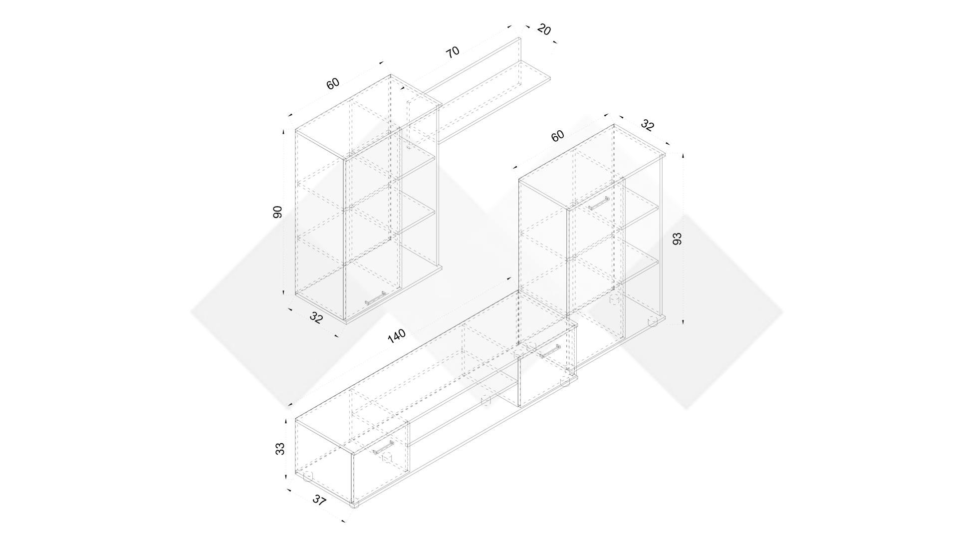 Основата на секцията представлява широк ТВ шкаф с удобен плот, два отворени рафта под него и два шкафа. Там ще откриеш достатъчно място, където да поставиш цялата си съпътстваща техника като ТВ приемници, DVD плейъри и други. До него е поставен висок шкаф с открити рафтове и врата, където с лекота ще аранжираш необходимите ти в ежедневието вещи. Окаченият шкаф също ще ти е от полза – освен да подредиш сувенири, фотоси и декорации, можеш да се възползваш и от закритата част, където да организираш дребни ел. уреди или неща, които да останат скрити от погледите. Към секцията сме добавили и практична етажерка, подходяща за подреждане на книги, скъпи спомени като фотографии или сувенири, а можеш и да аранжираш със стилни декорации и украси – изборът е твой!