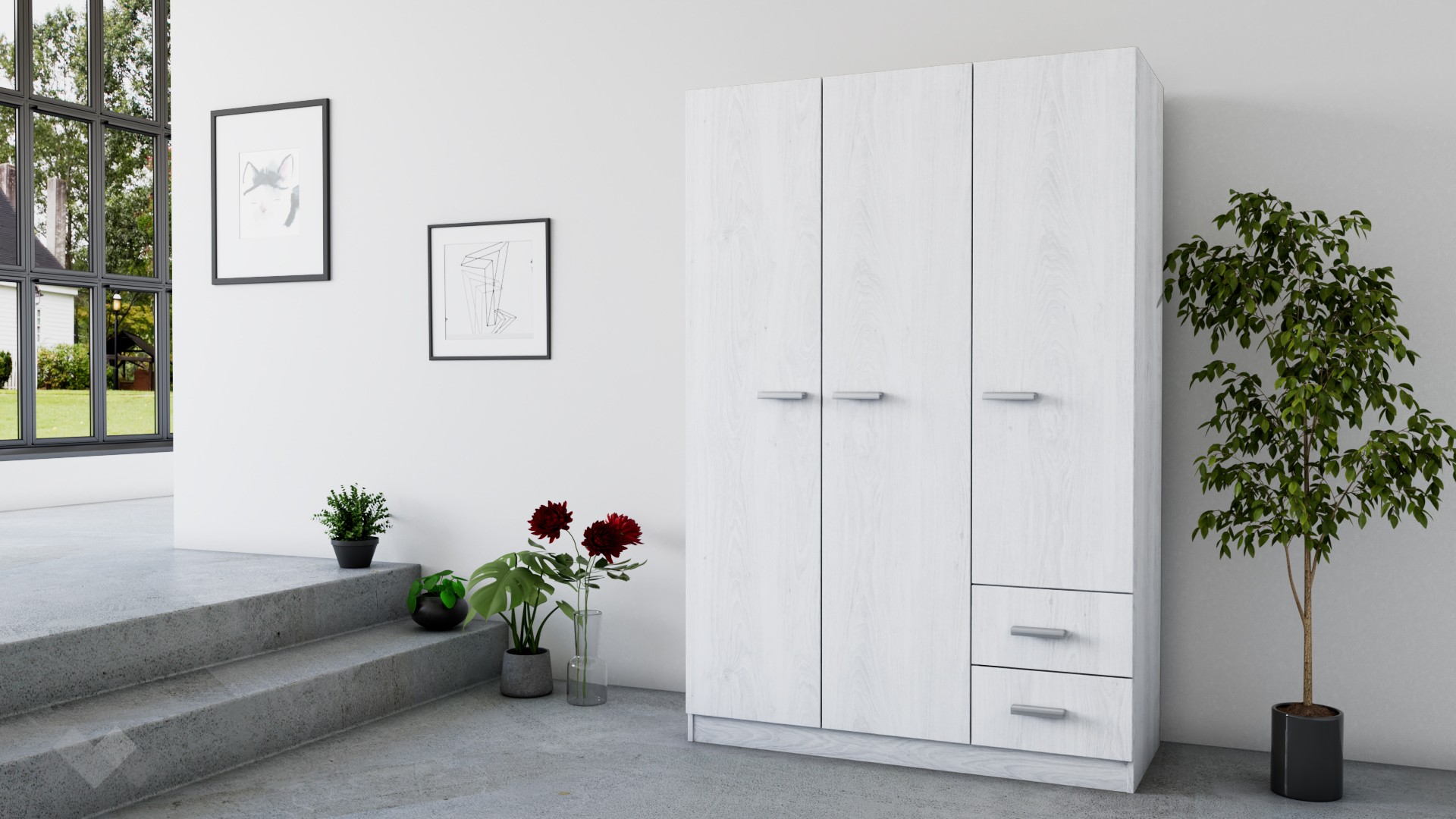 Трикрилният гардероб Арго с 2 чекмеджета е перфектният избор за почитателите на мебели със семпъл и изчистен дизайн. Той е практично разпределен, изцяло отговарящ на съвременните стандарти за съхранение на дрехи.
