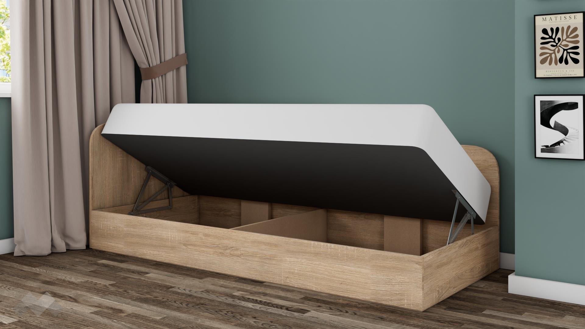 Повдигащият механизъм осигурява лесен достъп до просторна подматрачна площ, подходяща за съхранение на завивки, възглавници и други принадлежности. Разделителят в пространството под матрака позволява удобна организация на съхраняваните вещи, елиминирайки нуждата от допълнителни шкафове.