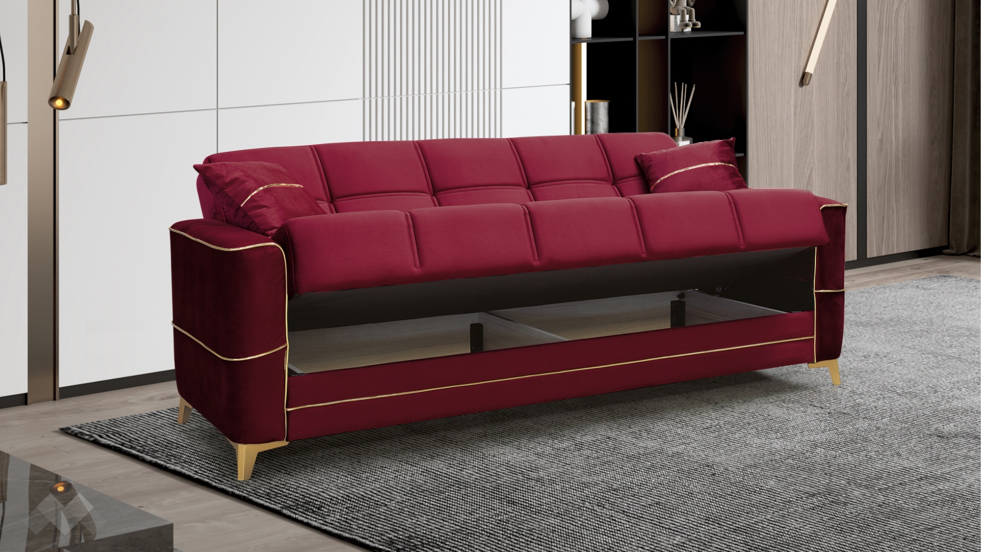 Диван Астон е и функционален - благодарение на клик-клак механизма ще разполагаш с повече пространство за релакс - 112/190 см, а под седалката се крие удобна ракла, където да съхраняваш завивки, възглавници и други вещи. Дамаската е приятна на допир, изработена от здрав и устойчив текстил.