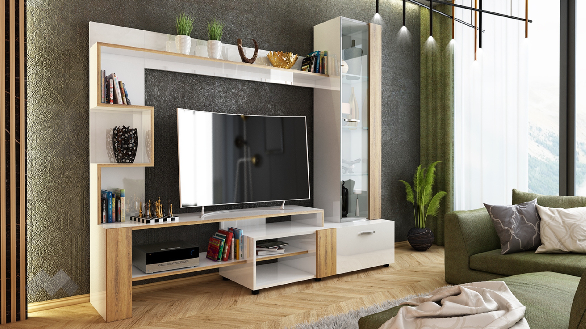 ТВ шкафът е съставен от няколко отворени пространства, където да подредиш всичките си ТВ приемници или друга техника, така те винаги ще са ти под ръка. Предлага се с етажерка, която започва от ТВ шкафа и продължава по височината на секцията.