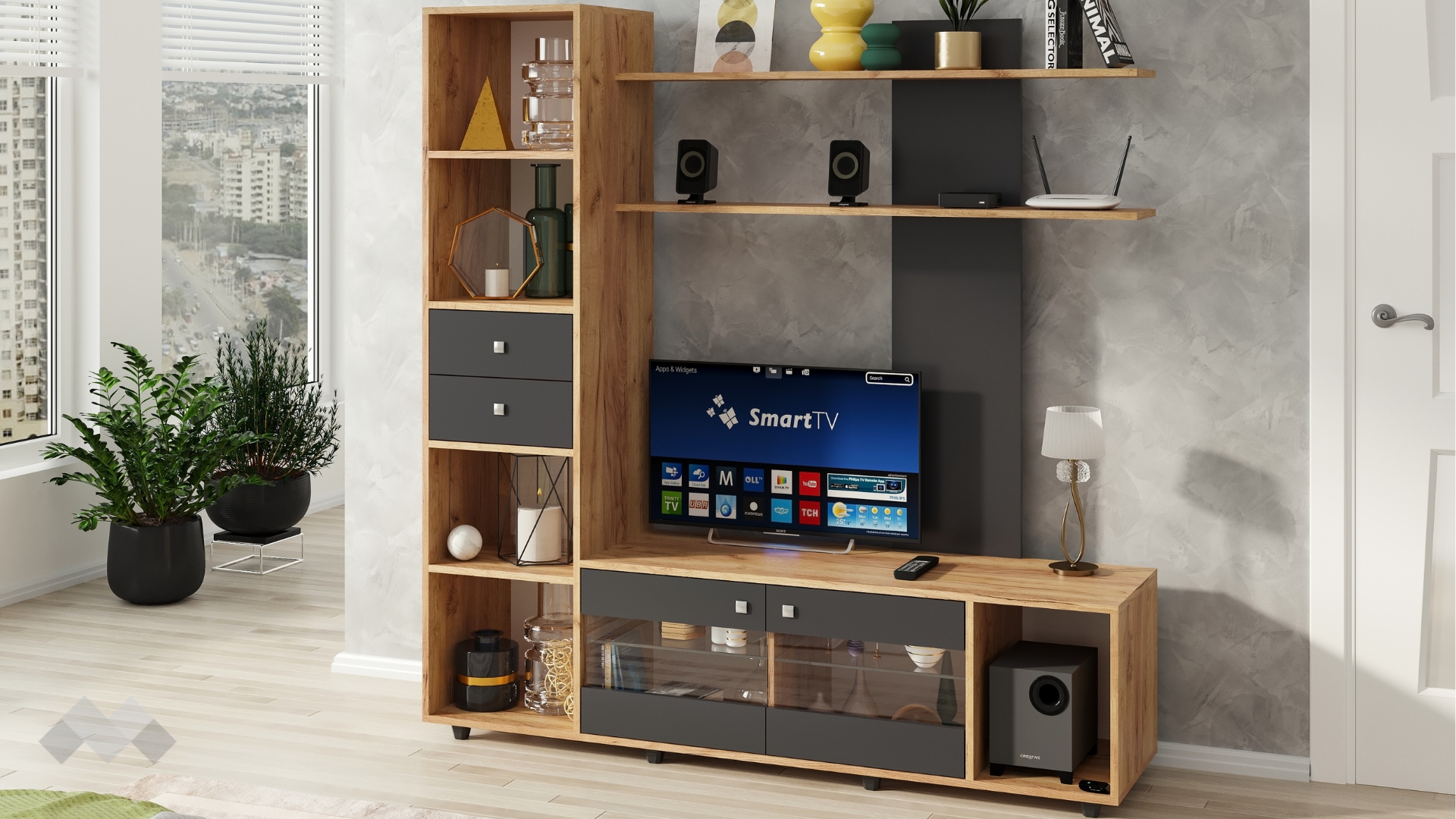 Тя е подходяща за малките и средни жилища, където пространството е особено ценно. Холната секция е с дължина 160 см и височина 167 см, което ти дава възможност да използваш функционално и най-горните плотове като полица за книги, вази, сувенири, семейни фотографии и декорации. В центъра е оставено място за телевизор, а на етажерката вдясно удобно можеш да подредиш книги, съдове, лични вещи и обичайните за всеки дом аксесоари.