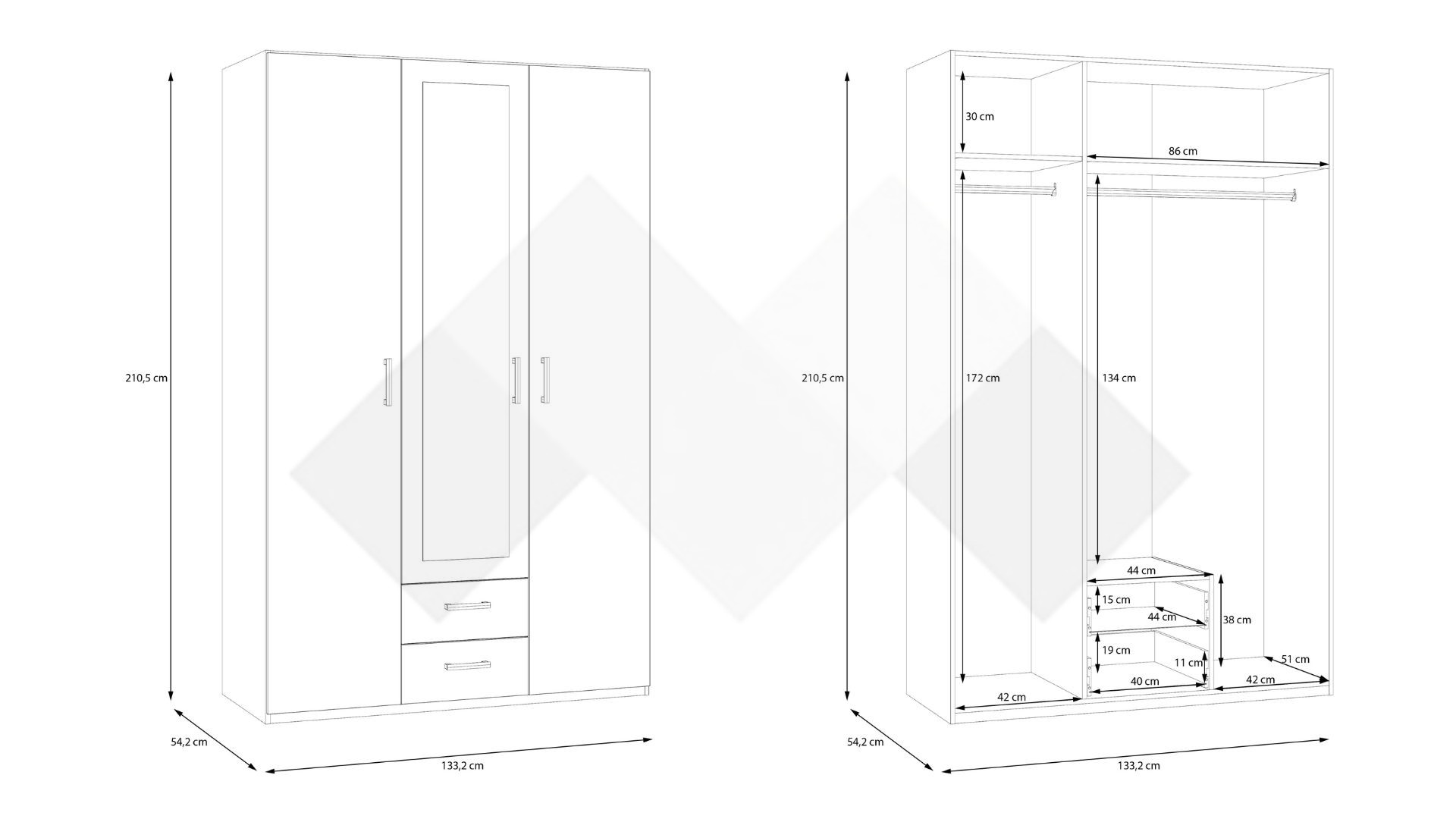Той ще те впечатли с функционално разпределение, което ще ти позволи да подредиш добре всички дрехи и аксесоари. Благодарение на изчистения и модерен дизайн, този гардероб би се вписал във всеки интериор. Той радва със своята практичност - а твое разположение са два лоста за закачалки, два рафта за съхранение на дрехи или вещи и две чекмеджета в средата на гардероба. Така всичко ще бъде перфектно организирано.