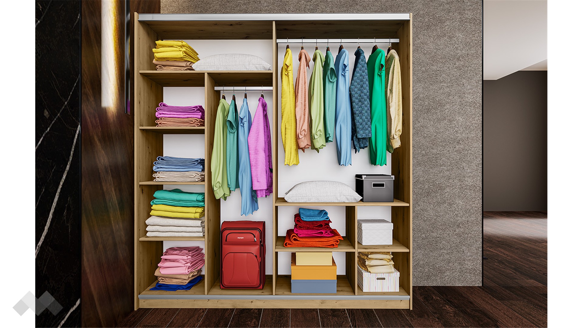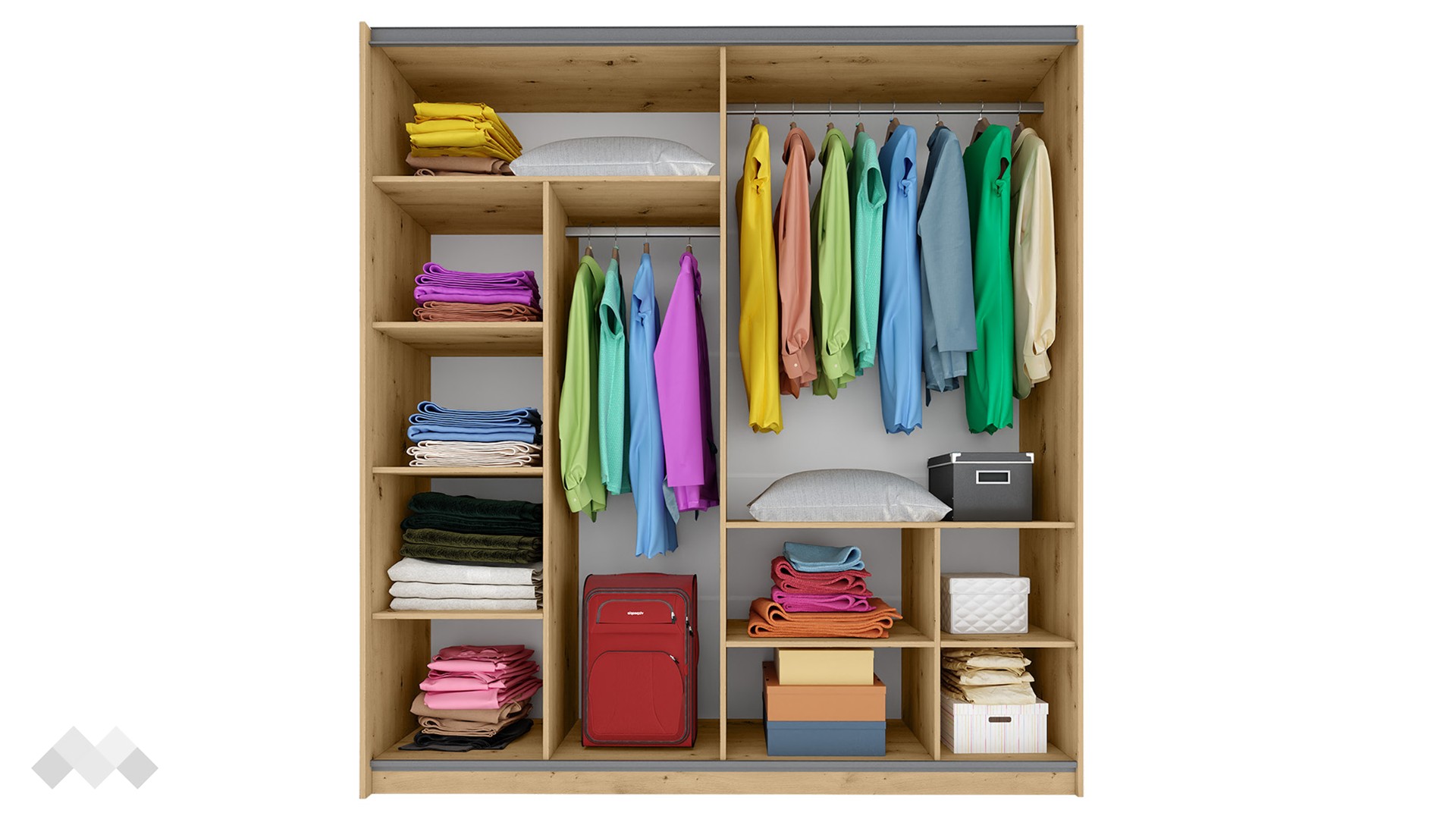 Гардероб Бедфорд ще те изуми със своята практичност и функционалност на най-високо ниво. Той е двукрилен гардероб с плъзгащи врати, така че няма да е необходимо да осигуряваш допълнително място пред него за отваряне. Гардеробът е достатъчно просторен, за да организираш добре всички сгънати дрехи или тези, които са на закачалки.