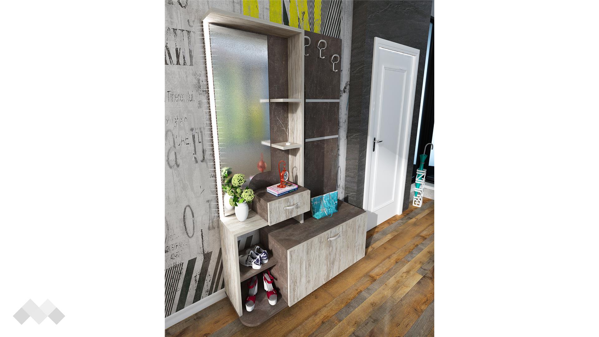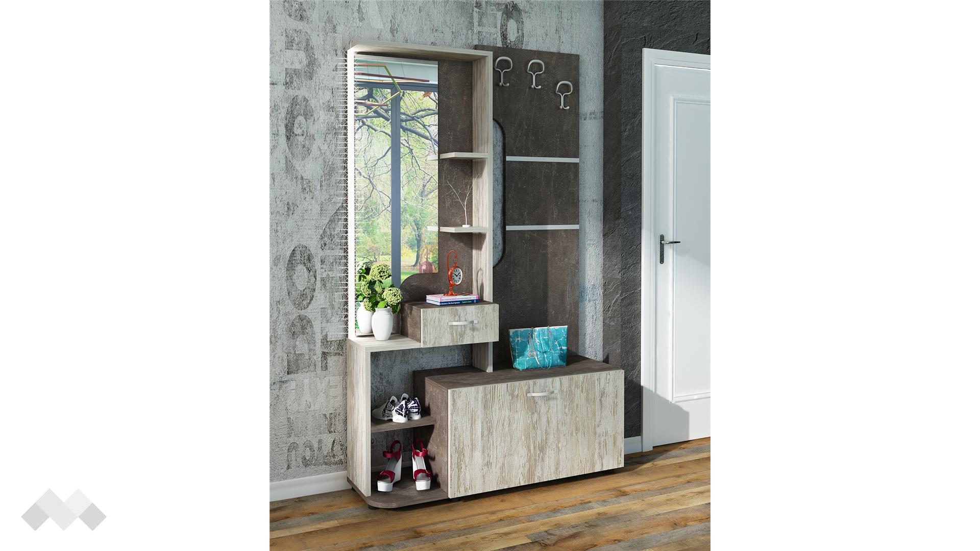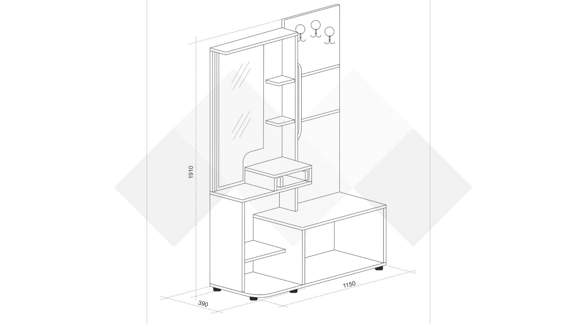 Портмантото има три закачалки за връхни дрехи, шалове и други по-обемни дрехи от върху единия плот. На другия плот е разположено огледало с три рафтчета и чекмедже, подходящи за по-малки необходими вещи, козметика или декорация. Над огледалото има още един по-голям рафт за кутии, шапки или дрехи.