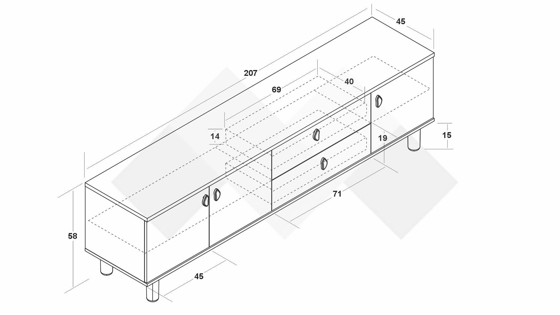 Просторен и функционален ТВ шкаф Бохем ще те изненада с плотът си дълъг цели 207 сантиметра - достатъчно пространство както за малък, така и за доста голям телевизор или просто за декорация. Предоставя ти шкаф с две врати, зад които се крие един рафт, две чекмеджета и още една врата с рафт зад нея. В тях може да прибереш конзоли, приемници или вещи, които искаш да останат скрити за гостите. Високите крачета позволяват лесно и удобно почистване.
