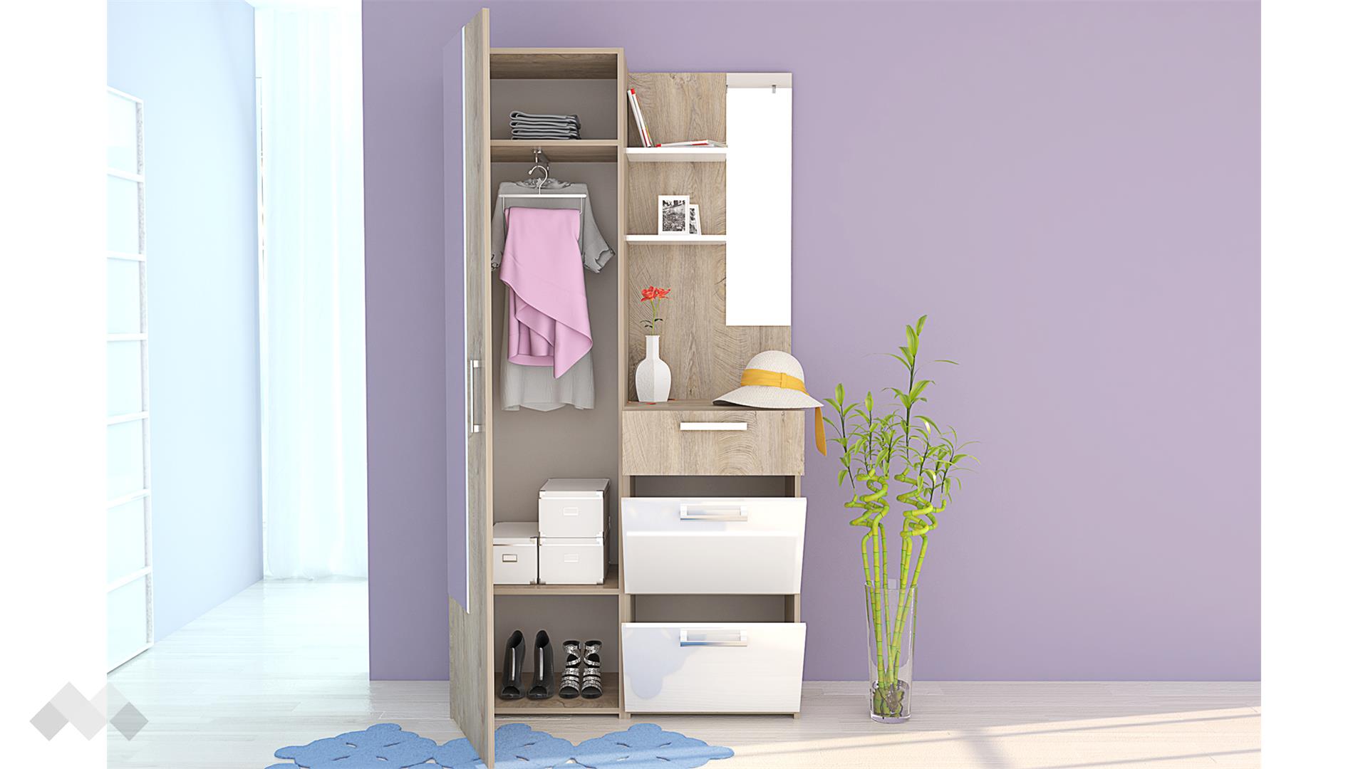 Освен с безупречна визия, портманто Бони се отличава и с изключителна функционалност. Разполага с еднокрилен гардероб за якета, палта или други връхни дрехи. Вътрешното му разпределение се състои от два рафта и изтеглящ се лост. От външната страна на гардероба е поставено голямо огледало, което ще ти даде възможност да се огледаш в цял ръст преди да излезеш. Освен това, ще внесе повече светлина в помещението. В двата шкафа с падащи врати с лекота ще организираш всичките си обувки. Чекмеджето ще приюти дребните вещи, които искаш да ти бъдат под ръка. Благодарение на допълнителното огледало над чекмеджето, портмантото може да ти послужи и като тоалетка – на плота над чекмеджето може да поставиш козметика, парфюми или други принадлежности. Двата отворени рафта са подходящо място за подреждане на декорации, аксесоари или още козметика.