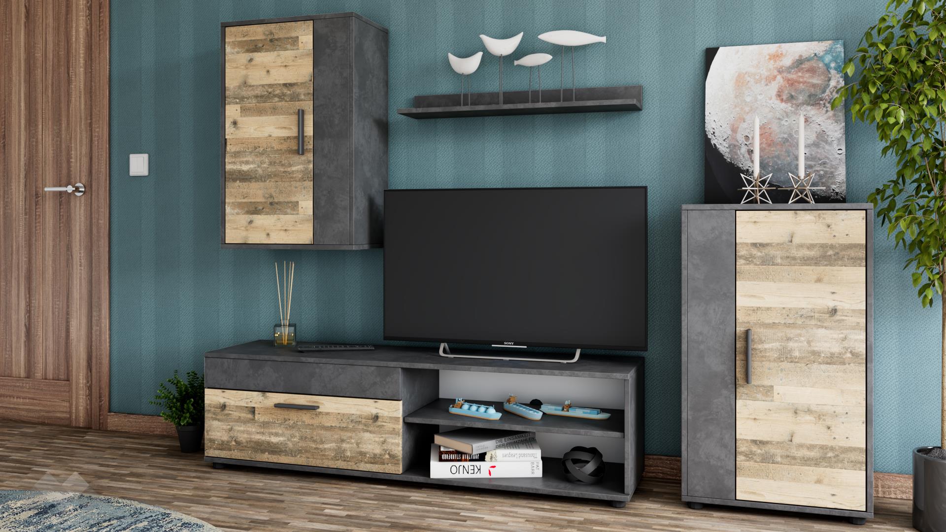 ⭐ Предимства: ✓ 2 отворени рафта ✓ ТВ шкаф ✓ висок шкаф ✓ окачен шкаф ✓ етажерка ✓ модерен дизайн ✓ функционална и практична ✓ качествена изработка ✓ 16 мм ПДЧ