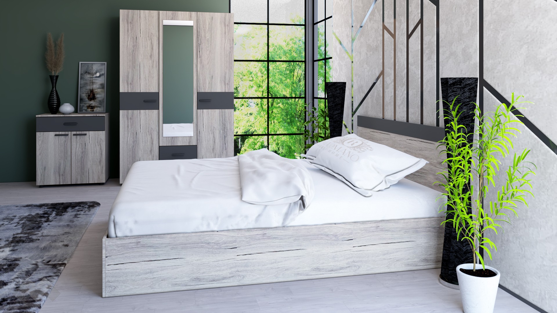 Спален комплект Дани D2 ще внесе усещане за стил и уют и ще направи спалнята ти мечтано кътче. Разполага с всичко, от което се нуждаеш – спалня, гардероб с отлично разпределение и скрин с чекмедже и шкафче с две вратички.