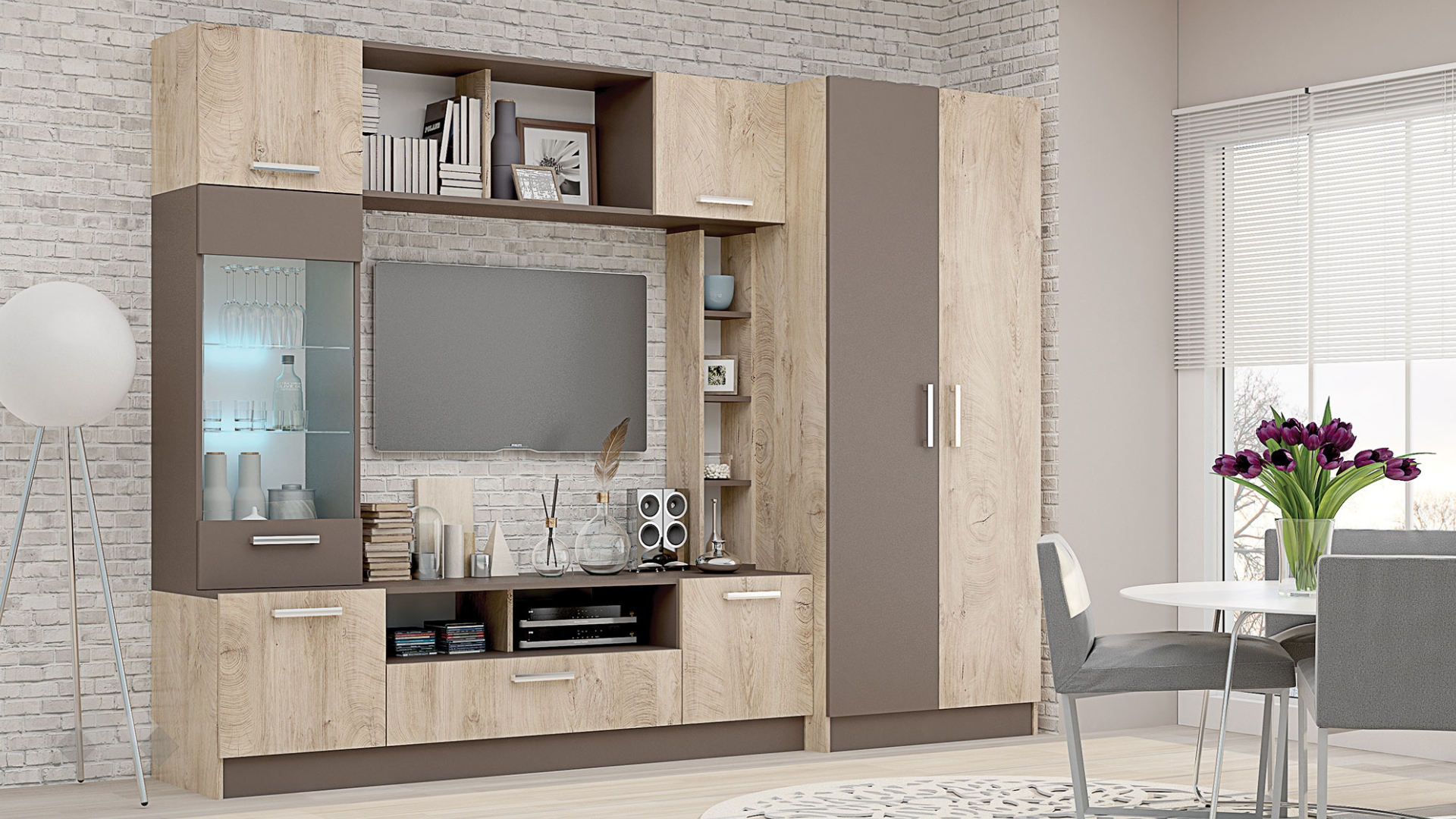 ТВ шкафът се състои от два шкафа с вратички, две отворени ниши и голямо чекмедже. Там ще откриеш достатъчно място за цялата си съпътстваща техника като ТВ приемници, DVD плейъри или други. Витринният шкаф е с два остъклени рафта, подходящи за красивите ти сервизи или любимите сувенири, които ще засияят благодарение на дискретното LED осветление, а това няма как да убегне от погледите на гостите ти. Над ТВ шкафа разполагаш с етажерка, на която можеш да подредиш стилни декорации, скъпи фотографии или други неща, които искаш да бъдат видими за твоите гости. В горната част на секцията са позиционирани два отворени шкафа за любимите ти книги и сувенири, както и два затворени шкафа за вещите, които искаш да останат скрити от погледите. Зад вратите на двукрилния гардероб се крият лост за закачалки и два рафта, където можеш да организираш дрехите, за които все не ти достига място в гардероба в спалнята.
